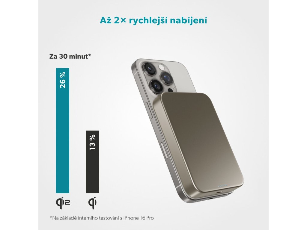 Díky technologii Qi2 si užijete bezdrátové nabíjení až 2× rychlejší než standardní Qi nabíjení, s maximálním výkonem 15 W. Silný magnet zajistí bezpečné přichycení k vašemu smartphonu, takže se nemusíte obávat nechtěného odpojení.