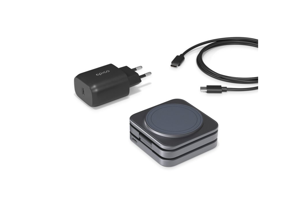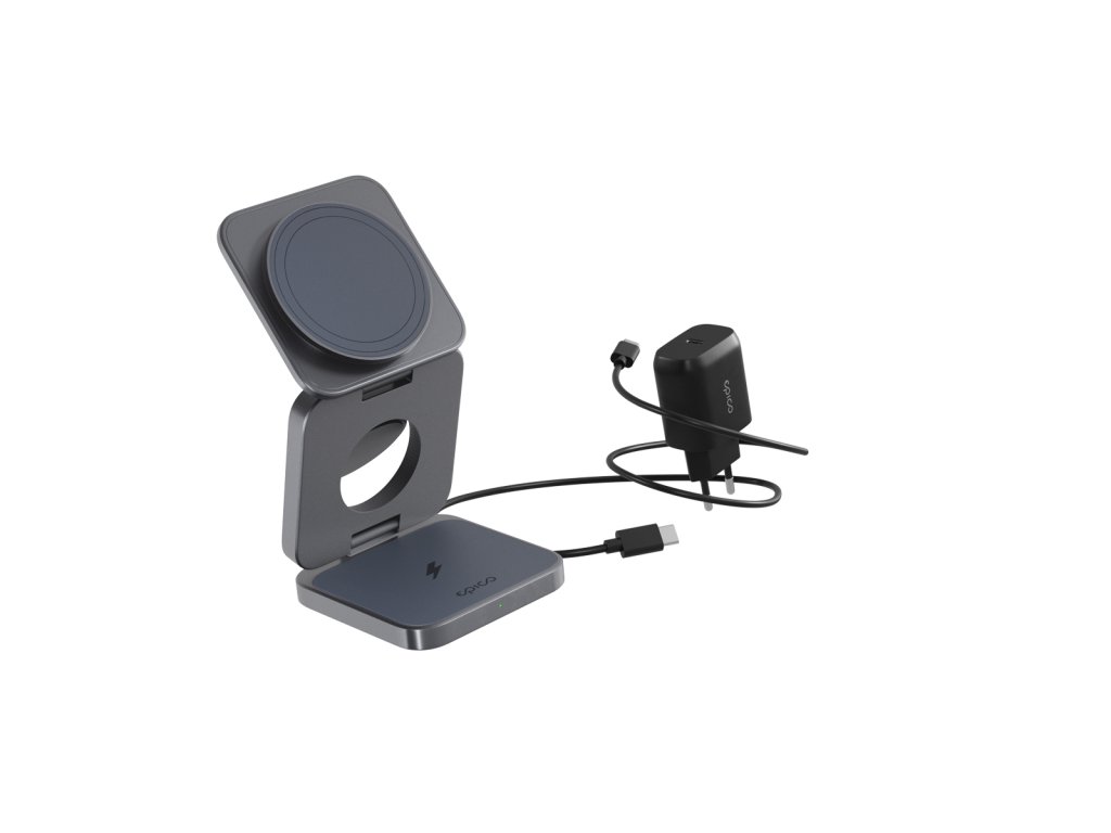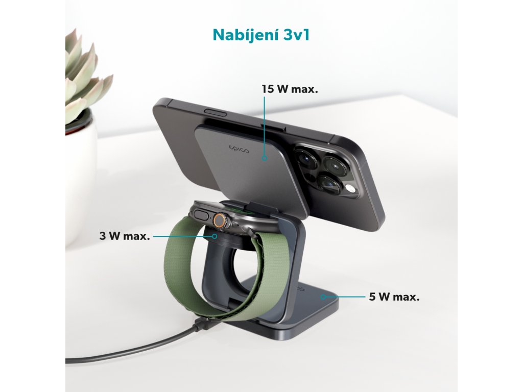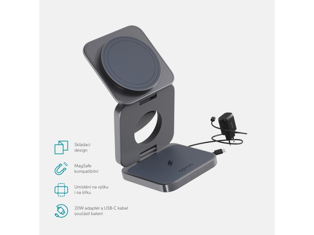 Bezdrátová nabíječka s podporou MagSafe, celkový výstup 23W, vstup USB-C, základna pro hodinky Apple Watch, základna pro AirPods, 1m kabel a adaptér součástíKompaktní cestovní nabíječka pro všechna vaše zařízení Kompatibilita s MagSafe a Qi2: Bezpečné magnetické připojení pro pohodlné bezdrátové nabíjení.15W bezdrátový výstup: Poskytuje až 15W bezdrátové nabíjení pro kompatibilní smartphony a 7,5W pro iPhony. 3v1 nabíjení: Nabíjejte současně smartphone, Apple Watch (3W) i AirPods (5W). Skladný design: Ve složeném stavu nezabere skoro žádné místo ? perfektní na cesty i doma. Flexibilní umístění: Nastavte si obrazovku do ideálního úhlu ? na výšku nebo na šířku ? s režimem StandBy pro zobrazení času a oznámení. Protiskluzová silikonová základna: Udrží nabíječku pevně na místě. LED indikátor: Mějte přehled o stavu nabíjení na první pohled.