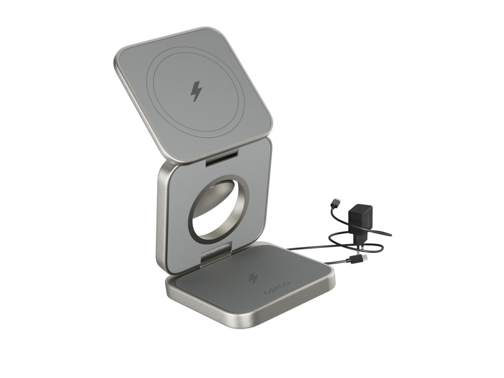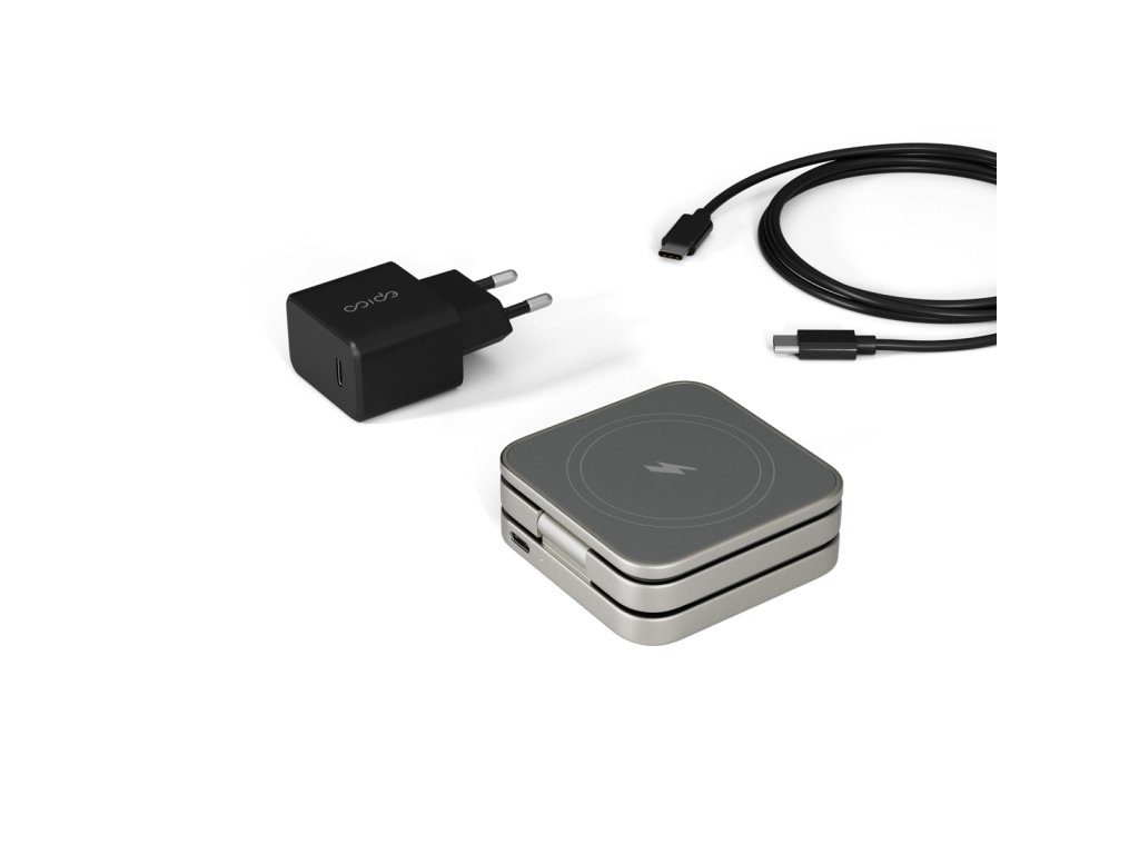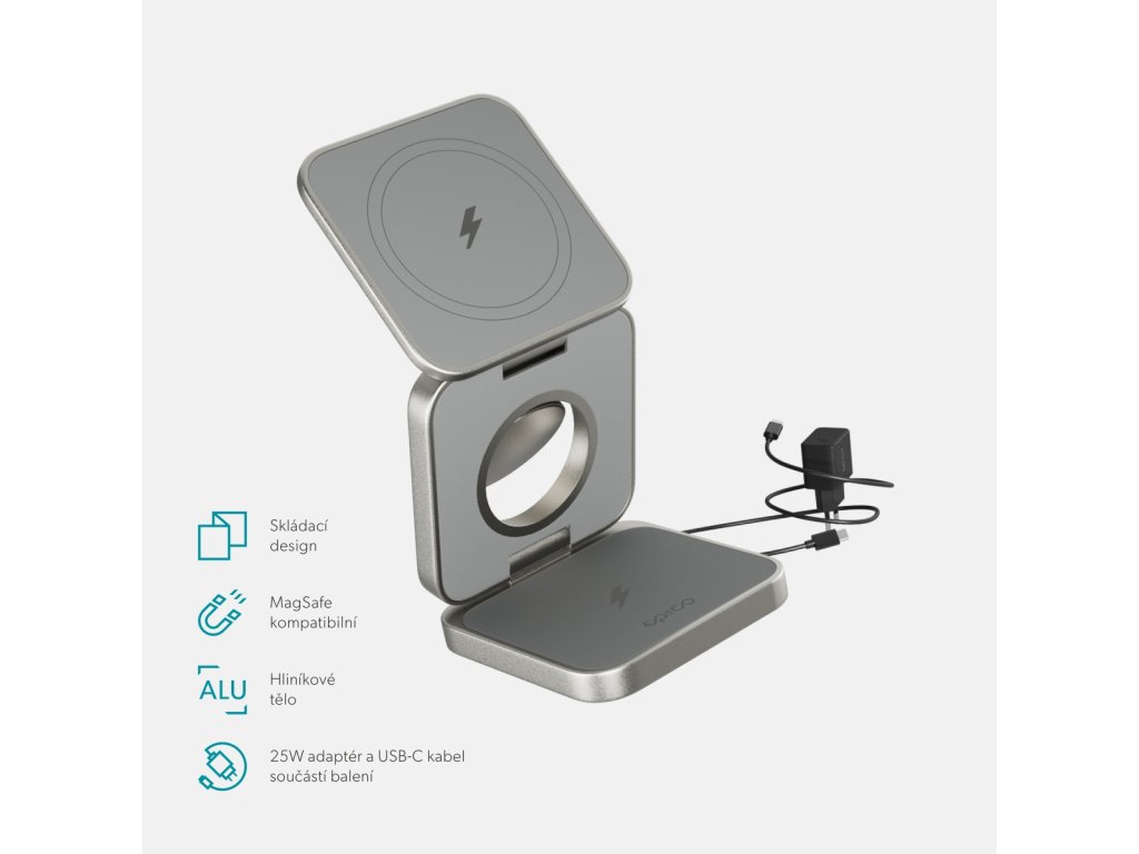 Bezdrátová nabíječka 3v1, 15 W maximální bezdrátový výstup (7,5 W pro iPhone), nabíjecí základna 5 W, modul pro Apple Watch 2,5 W, 25W adaptér a USB-C kabel v balení, barva titanová.Cestovní skládací nabíječka pro všechna vaše zařízení Kompatibilita MagSafe a Qi2: Bezproblémové bezdrátové nabíjení s bezpečným magnetickým uchycením.15W bezdrátový výstup: Poskytuje až 15W bezdrátové nabíjení pro kompatibilní smartphony a 7,5W pro iPhony. 3v1 nabíjení: Umožňuje současné nabíjení smartphonu, Apple Watch (2,5W) a AirPods (5W). Hliníkové tělo: Prémiové a odolné hliníkové tělo zabraňuje přehřívání. Kompaktní design: Po složení zabere minimum místa, takže ji snadno vezmete kamkoli s sebou. Stabilní silikonová základna s protiskluzovou silikonovou základnou. Flexibilní umístění: Podporuje umístění smartphonu na výšku i na šířku.