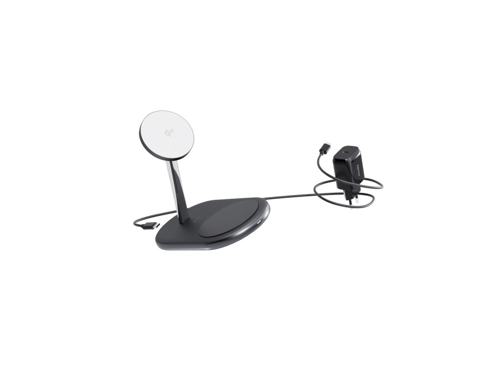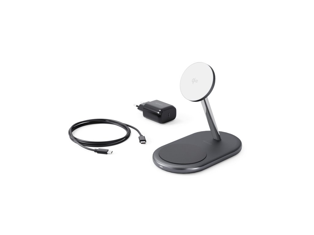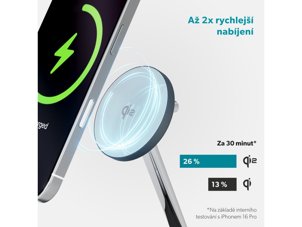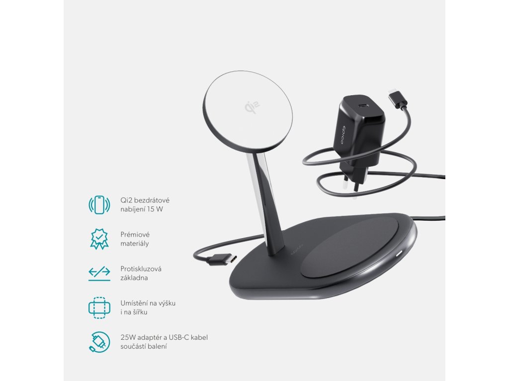 Qi2 bezdrátová nabíječka 2v1, 15 W bezdrátový výstup pro iPhone i Android, nabíjecí základna 5 W, 25W adaptér a USB-C kabel v balení, barva černá.Bezproblémové nabíjení s propracovaným designem Elegantní design: Vyrobeno z prémiových materiálů, které z této nabíječky dělají krásný doplněk na váš stůl. Certifikace Qi2 & kompatibilita s MagSafe. Užijte si až 2x rychlejší bezdrátové Qi2 nabíjení pro iPhone (15W) s magnetickým uchycením. 2v1 nabíjení: Umožňuje současné nabíjení smartphonu a AirPods (5W). Stabilní gumová základna: Vybavena protiskluzovou gumovou základnou pro lepší stabilitu. Flexibilní umístění: Podporuje umístění smartphonu na výšku i na šířku.
