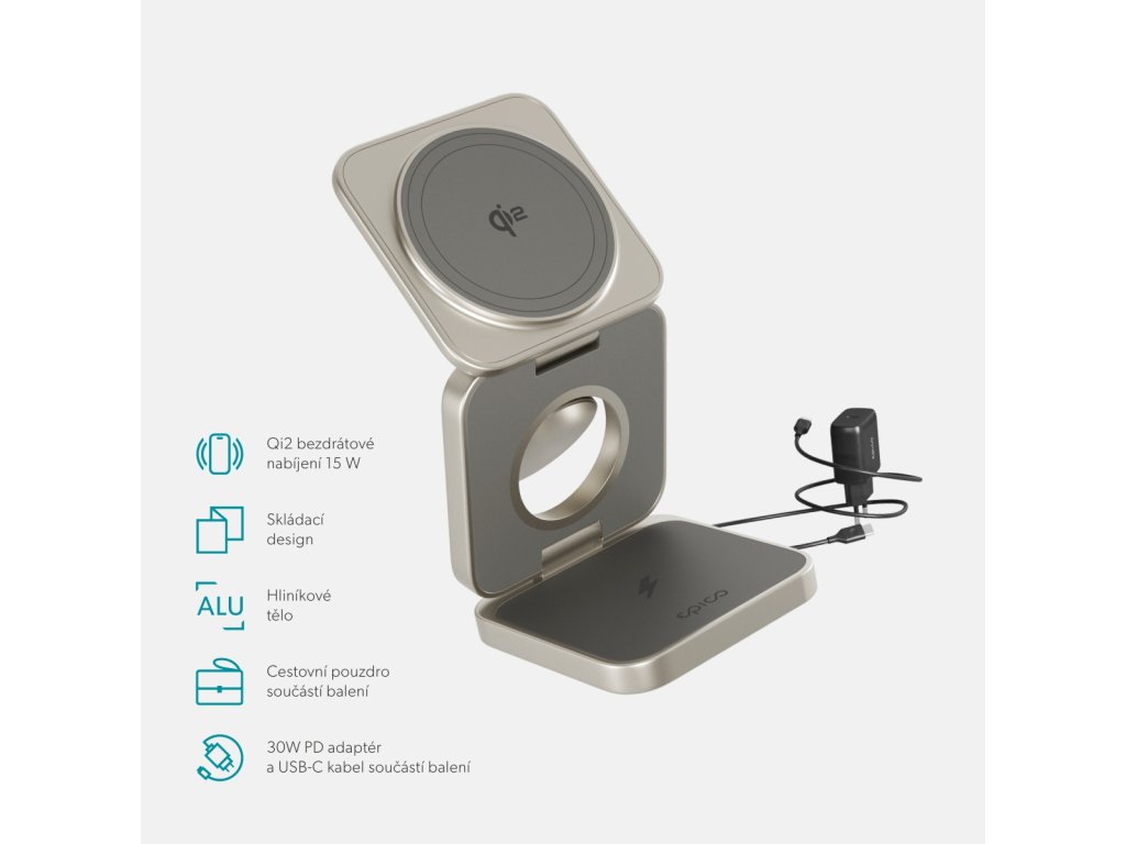 Elegantní skládací nabíječka připravená i na cestyCertifikace Qi2 & kompatibilita s MagSafe: Užijte si až 2x rychlejší bezdrátové Qi2 nabíjení pro iPhone (15W) s pevným magnetickým uchycením.