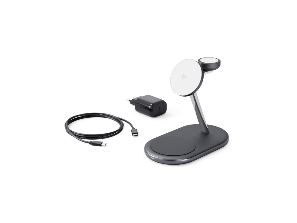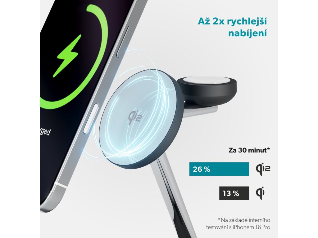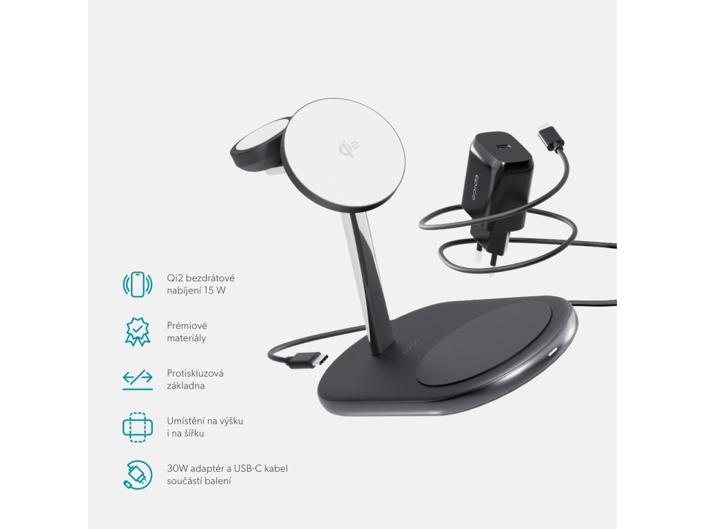 Qi2 bezdrátová nabíječka 3v1, 15 W bezdrátový výstup pro iPhone i Android, nabíjecí základna 5 W, modul pro Apple Watch 3 W/5 W, 30W adaptér a USB-C kabel v balení, barva černá.Krásně zpracované řešení pro všechny vaše potřeby nabíjení. Elegantní design: Vyrobeno z prémiových materiálů, které z této nabíječky dělají krásný doplněk na váš stůl. Certifikace Qi2 & kompatibilita s MagSafe. Užijte si až 2x rychlejší bezdrátové Qi2 nabíjení pro iPhone (15W) s pevným magnetickým uchycením. 3v1 nabíjení: Nabíjejte současně smartphone, Apple Watch (5W) i AirPods (5W). Certifikace Made for Apple Watch: Certifikováno společností Apple pro zajištění plné kompatibility s budoucími aktualizacemi a bezchybný výkon Stabilní gumová základna: Vybavena protiskluzovou gumovou základnou pro lepší stabilitu. Flexibilní umístění: Podporuje umístění smartphonu na výšku i na šířku.