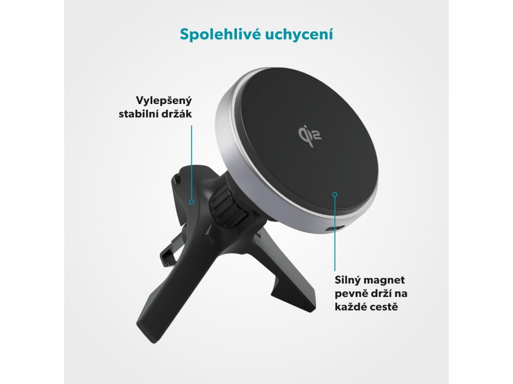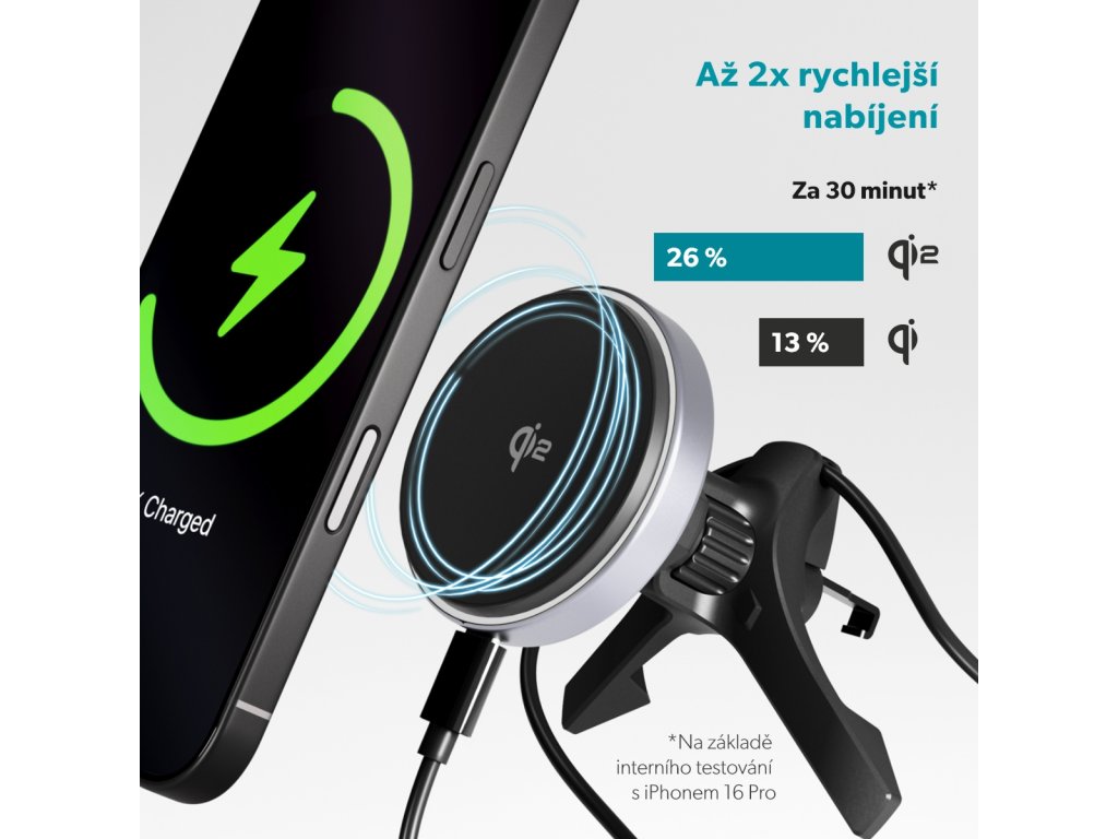 Bezdrátová nabíječka a držák do auta, Qi2 certifikovaná, s podporou MagSafe, bezdrátové nabíjení 15 W, hliníkové tělo, USB-C na USB-C kabel součástí.Vylepšete svou jízdu s rychlým nabíjením Qi2 Certifikace Qi2 & MagSafe kompatibilita: Užijte si rychlé 15W bezdrátové nabíjení díky technologii Qi2 i pro iPhony. Nabíjejte až 2x rychleji než s běžnými Qi nabíječkami. Hliníkové tělo: Elegantní a odolné provedení s efektivním odvodem tepla. Silný magnet: Zajišťuje, že váš telefon zůstane bezpečně upevněn i během jízdy. Flexibilní nastavení: Úhel obrazovky si snadno nastavíte podle potřeby. Držák do ventilace: Stabilní, snadno nastavitelný a kompatibilní s většinou typů ventilací.