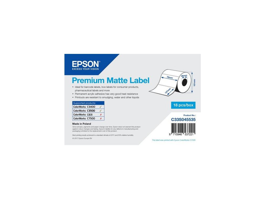 EPSON Premium Matte Label - Die-cut Roll: 76mm x 127mm, 265 labelsHladký a jasně bílý matný povrch společně s pigmentovými inkousty Epson DURABrite Ultra zajišťuje rychlé schnutí a odolnost vůči poškrábání, vodě a zahřívání. Univerzální permanentní akrylátové lepidlo je zárukou bezstarostného použití a skvělého přilepení na různé povrchy i za nízkých teplot.
