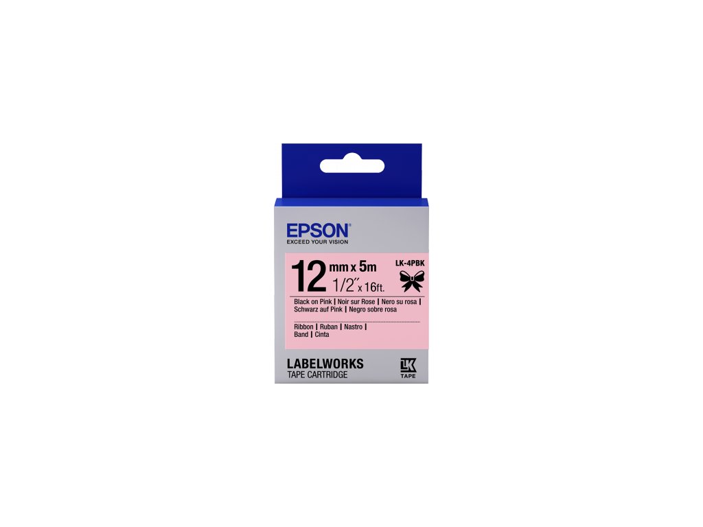 C53S654031 - Zásobník se štítky EPSON - saténová stuha, LK-4PBK, černá/růžová, 12 mm (5m)- 5 metrová páska štítků za skvělou cenu