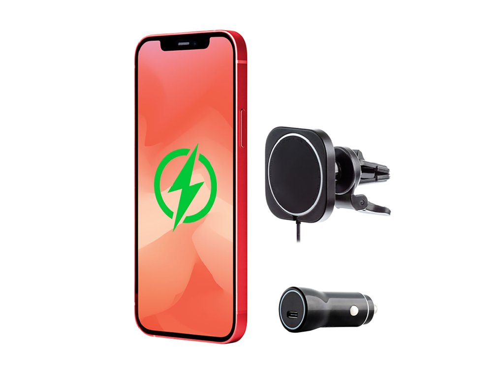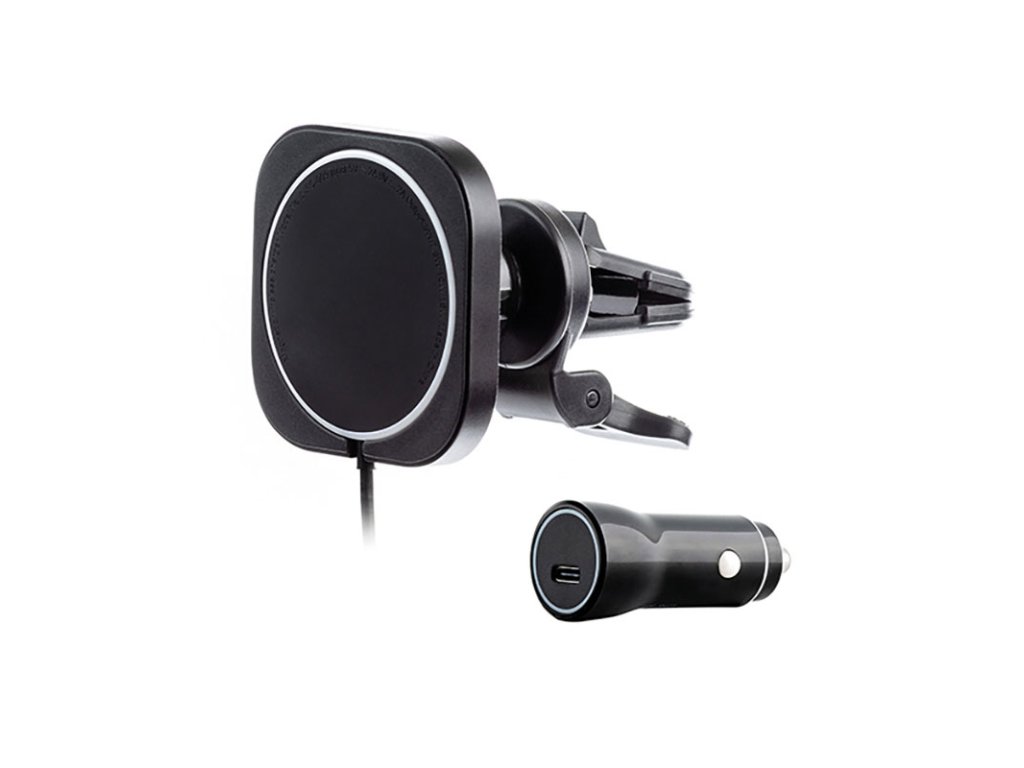 Bezdrátová nabíječka s integrovaným USB-C kabelem a výkonem 15W. Součástí balení je držák do ventilace automobilu a nabíječka do zapalovače s výkonem až 20W. Nabíječka je kompatibilní s Apple MagSafe. Silné svorky zajistí, že držák bude držet přesně tam, kde potřebujete a díky pevné konstrukci udrží i rozměrnější zařízení jako ku příkladu Apple iPhone 13 Pro Max. Barva: černáDodatočné parametre