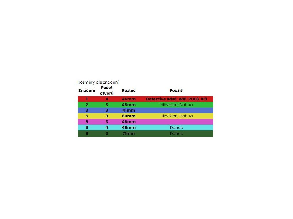 Instalační box pro kamery kamerového systému EVOLVEO Detective, vyrobený z hliníkové slitiny opatřený sadou těsnění a příslušenství pro montáž kamer. Umožňuje schovat konektory pro připojení kamery a ochránit je před povětrnostními vlivy. Na boxu jsou závitové otvory označené čísly pro uchycení všech druhů kamer, použitých s kamerovými systémy EVOLVEO Detective. Krabici lze využít i pro kamery jiných výrobců, vždy je nutné ověřit rozteč a uspořádání otvorů viz tabulka na obrázku.