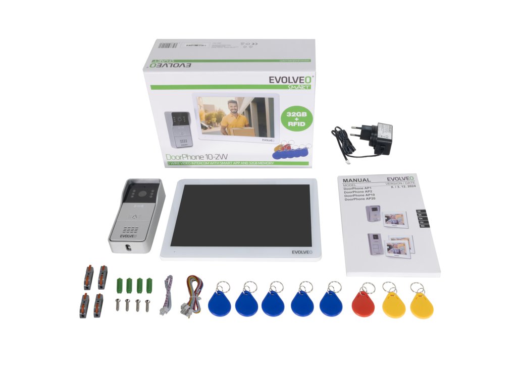 Balení obsahuje všechno potřebné: venkovní jednotku s kamerou a RFID čtečkou, vnitřní dotykový monitor s Wi-Fi, montážní materiál, napájecí adaptér, propojovací kabely i základní sadu RFID karet . A samozřejmě i přehledný návod k použití. Máte zde zkrátka k dispozici vše, co pro vytvoření moderního a bezpečného vstupního systému do vašeho domova potřebujete.