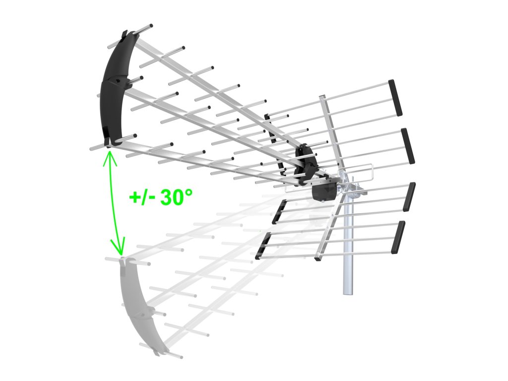 Venkovní, pasivní anténa pro příjem DVB-T/T2 signálu. Možnost vertikálního nastavení +/- 30° zvyšuje její zisk ve srovnání s anténami, které tuto nastavitelnost nemají.