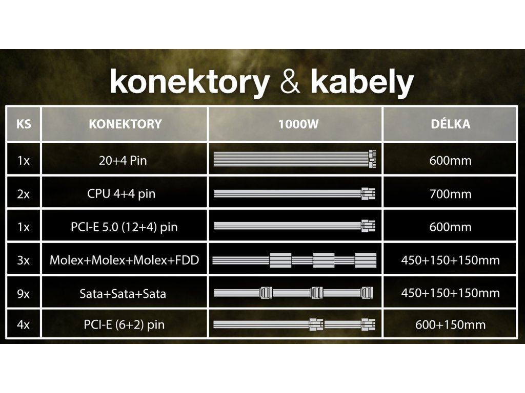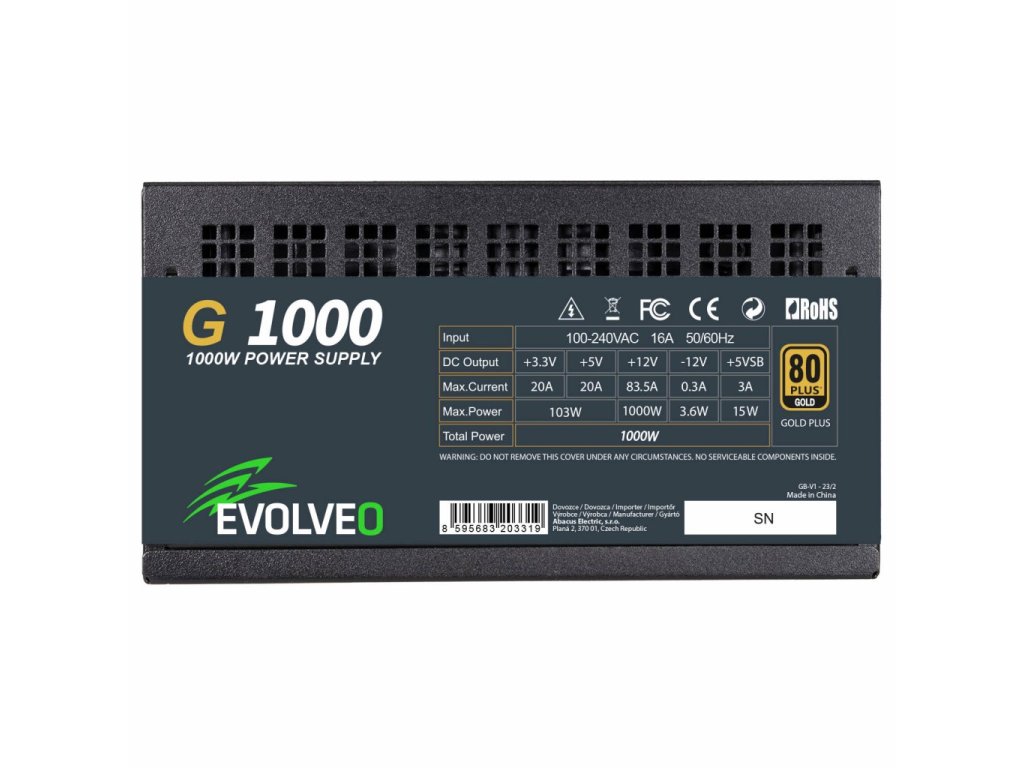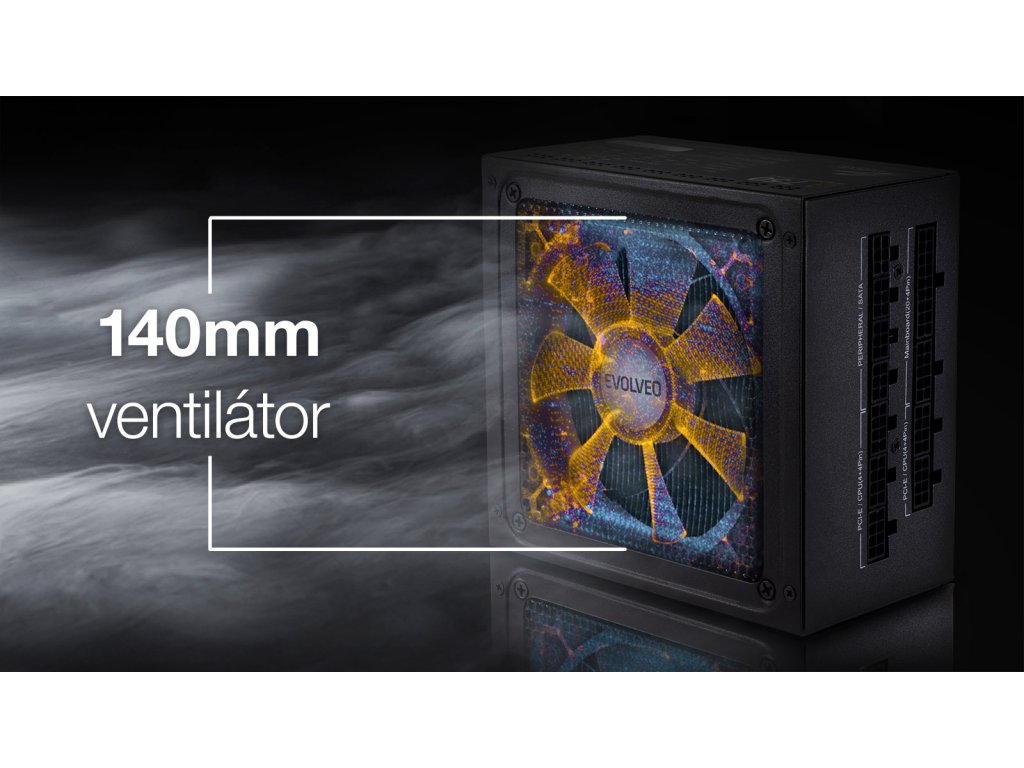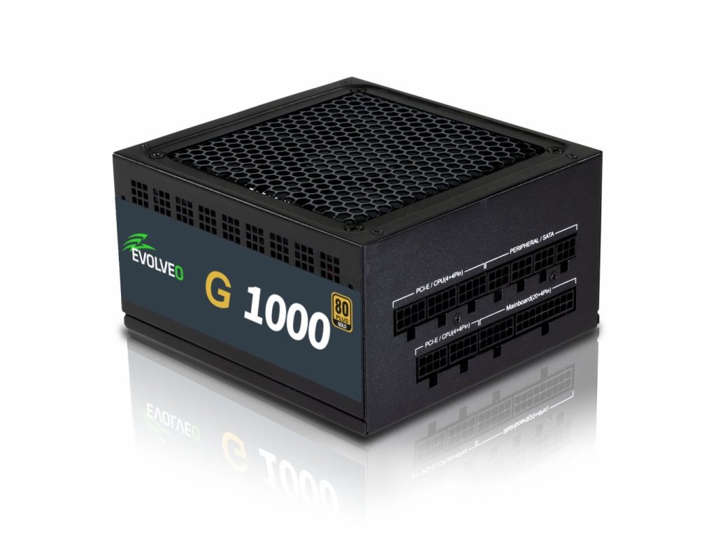 Zdroj EVOLVEO G1000 je ideální volba pro herní počítač, který má osazenou grafickou kartu s rozhraním PCIe 5.0. Vyjímá se především účinností s certifikací 80 PLUS GOLD zaručující účinnost až 90%. Zdroj je plně modulární, z toho důvodu je možné připojit jen nejnutnější kabely. Součástí je i tichý 140mm ventilátor. Vzhledem k velkému výkonu nemá tento zdroj semi-pasivní chlazení. Ventilátor zdroje je v stále v provozu a jeho otáčky jsou regulovány v závislosti na potřebě chlazení