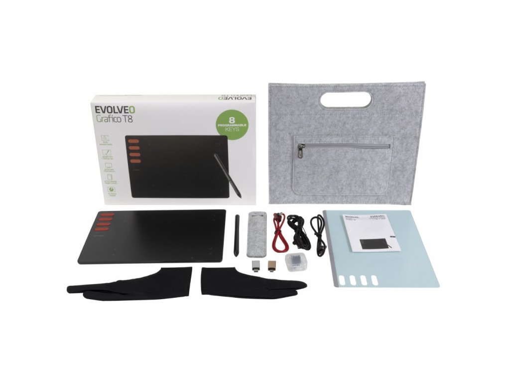 Ať chcete Grafico T8 používat profesionálně, nebo jen k občasným úpravám rodinných fotek, jistě oceníte, že bezdrátové pero nepotřebuje žádné baterie, nebo dobíjení. Pero je tak lehké a snadno se s ním pracuje. K pohodlné práci také dopomáhá grafická rukavice, která je součástí balení. Leváci jistě ocení i možnost invertování pracovní plochy, aby při práci nepřekážely multifunkční klávesy. Grafický tablet samotný je lehký a kompaktní a díky implementovaným ovladačům jej můžete používat téměř z jakéhokoli zařízení.