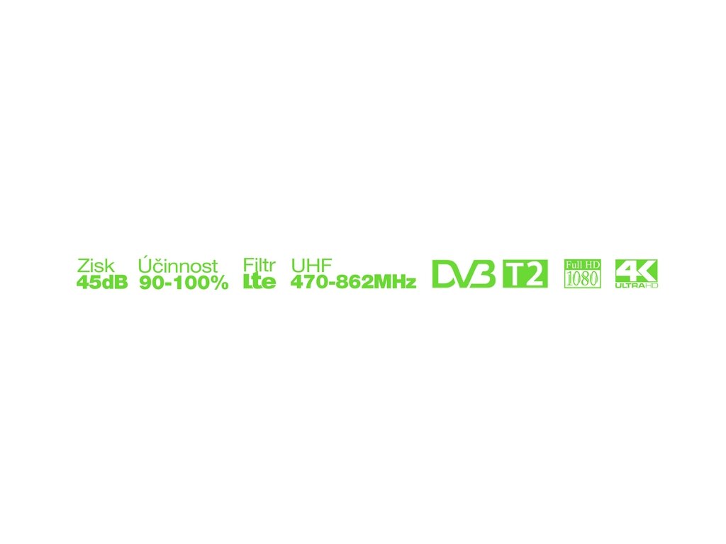 Vestavěný zesilovač s externím napájením a parametry předurčují anténu pro použití v oblastech se slabým TV signálem. Produkt je vybavený LTE filtrem, který odfiltruje signál mobilních operátorů a příjem TV signálu je tak zcela bez komplikací. Anténa zvládá příjem v širokém spektru 470-700MHz a umožní tak příjem všech TV kanálů. Účinnost přeměny TV signálu na elektrický signál je 90-100% v závislosti na frekvenci signálu. Anténa je připravena na příjem TV ve vysokém rozlišení obrazu 4K/UHD. Speciální aerodynamický tvar antény má lepší prevenci proti sněhu, čí proudění větru než antény klasických tvarů.