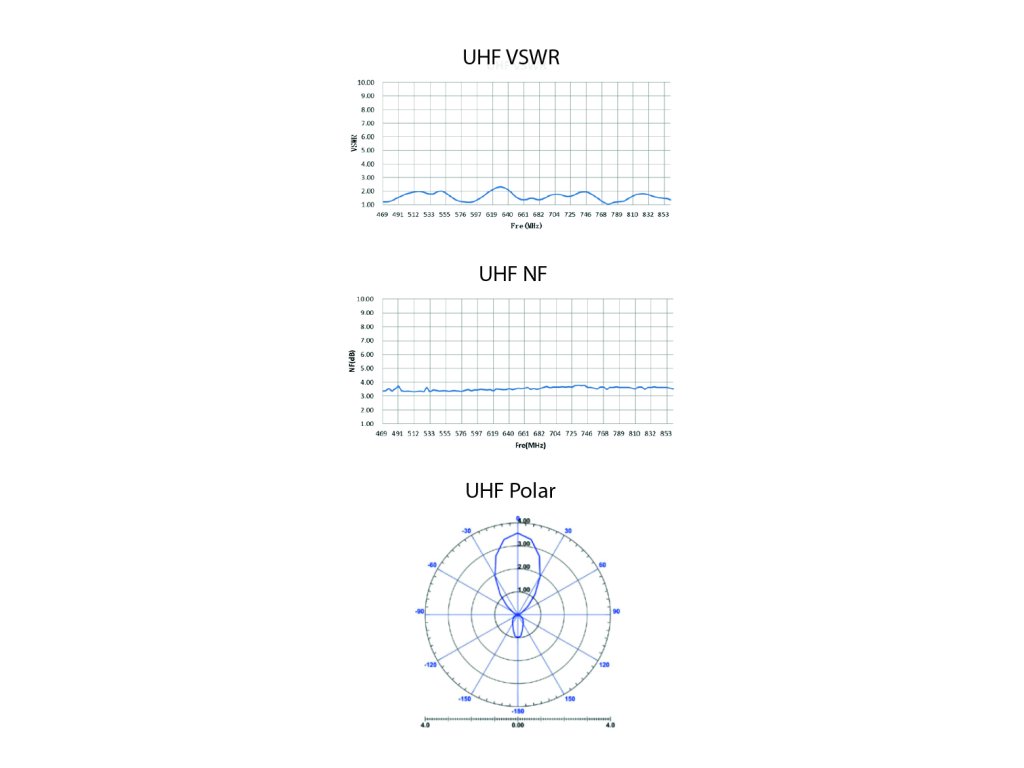 UHF VSWR (Voltage Standing Wave Ratio) graf vyjadřuje účinnost antény pro pásmu UHF. Koeficientem VSWR rovný 1 znamená přeměnu všech elektromagnetických vln na elektrický signál. Graf VSWR pro anténu HDO dosahuje velice vyrovnané účinnosti a prakticky pro žádné frekvenční pásmo nevykazuje nižší účinnost než 90%, tedy hodnota grafu VSWR není až na výjimky vyšší než 2.