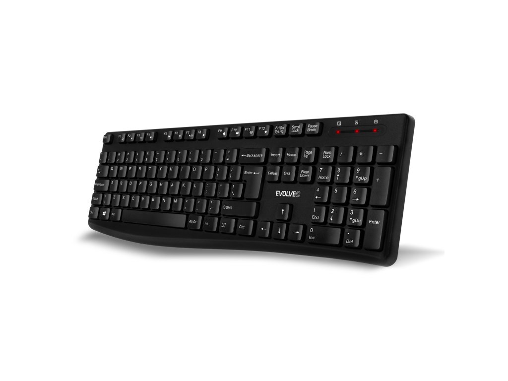 Klávesnice, která je součástí setu EVOLVEO K1050 obsahuje 105 klasicky rozložených nízkoprofilových kláves (s výškou 4,5 mm), díky nimž je fungování počítače plně ve vaší režii. Nechybí velká klávesa Enter, potisky s českými a slovenskými znaky ani trojice praktických LED indikátorů (NumLock, CapsLock a nízký stav baterie).
