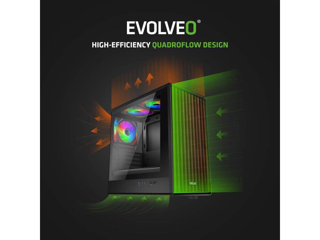 Aby se komponenty v PC skříni nepřehřívaly, využívá EVOLVEO Panthera-BK-3 systém QuadroFlow, který zajišťuje organizovaný průtok vzduchu čtyřmi proudy (přes horní, spodní, levou a pravou stranu skříně). Nedochází tak k žádnému chaotickému foukání větru – jde o promyšlenou taktiku, která vede k účinnému a přirozenému chlazení celé skříně.