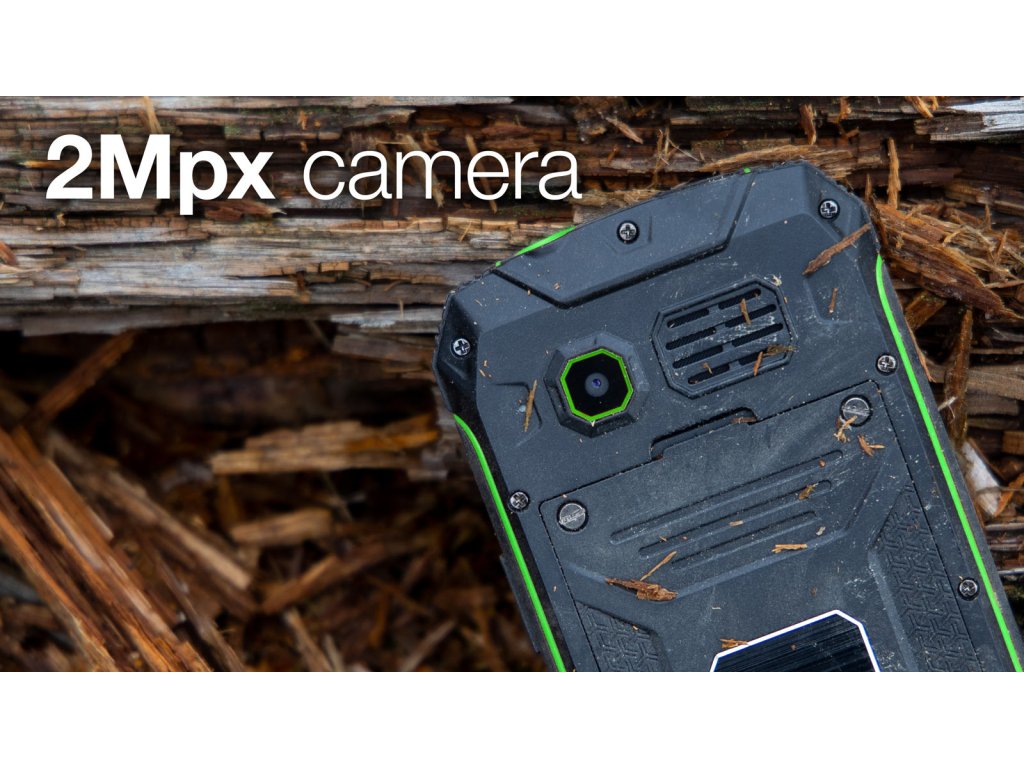 Součástí výbavy odolného telefonu je 2 Mpx fotoaparát, výkonná LED svítilna nebo vestavěné FM rádio s integrovanou anténou a automatickým laděním stanic. Z další výbavy můžete využít například kalendář, budíky nebo kalkulačku.