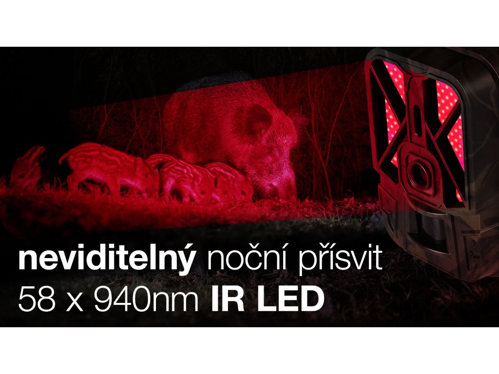 Infra noční přísvit je důležitá funkce každé fotopasti, díky 940nm LED diodám lze zařízení použít nejenom pro sledování zvěře, ale i k ostraze objektů, kdy narušitel není schopný v noci tento typ přísvitu pozorovat, na rozdíl od 850nm technologie. Díky 58 IR LED diodám s 940nm technologií dojde k velice dobrému osvětlení noční scény.