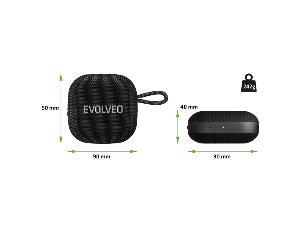 Kompaktní zpracování s minimální hmotností a menšími rozměry (90 × 40 × 90 mm) dělá z reproduktoru EVOLVEO TopSound ideálního cestovního parťáka, který se vám vejde prakticky kamkoliv. Pět gumových protiskluzových žeber na spodní straně navíc zajišťuje, že reproduktor zůstane tam, kde ho potřebujete, i když hudba rozvibruje celý stůl. A zásluhou praktického poutka můžete reproduktor jednoduše někam zavěsit nebo ho pohodlně přenášet. Prostě ho čapnete za poutko a jdete i se svou milovanou muzikou, kam vás nohy ponesou.