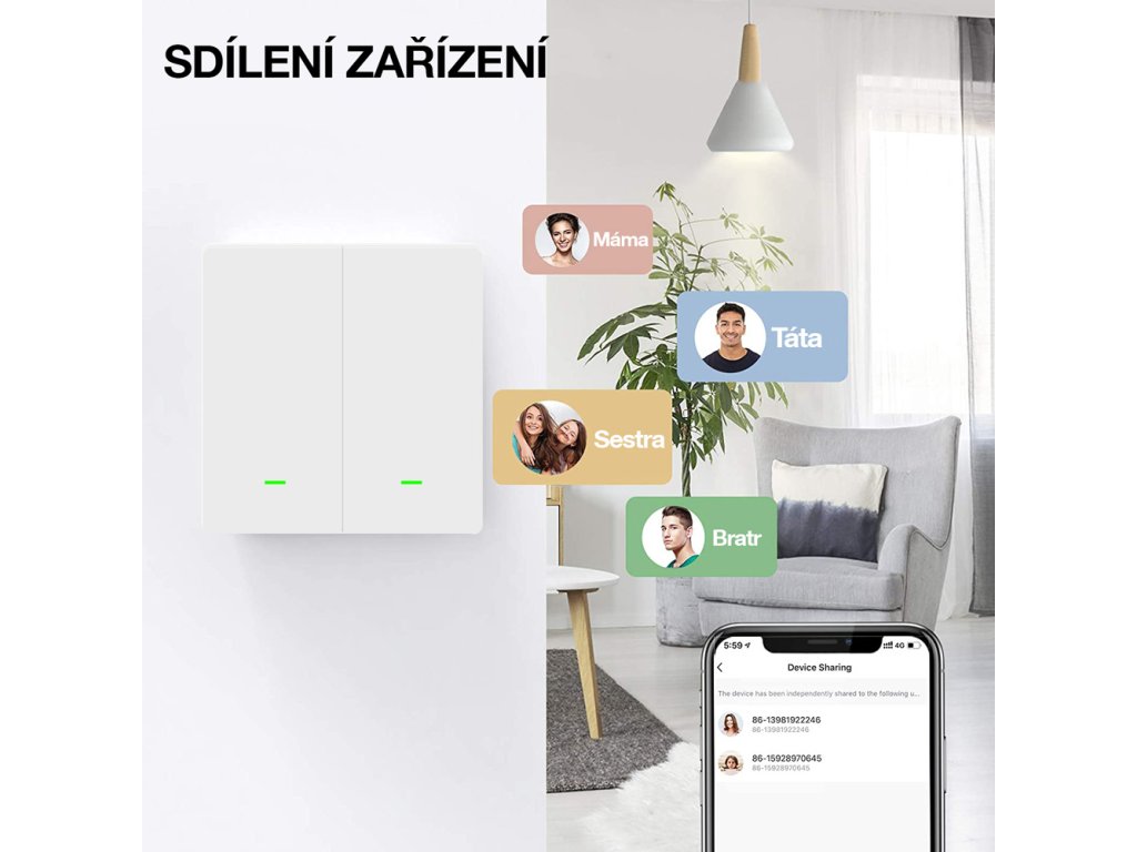 Chytrý vypínač nabízí flexibilní způsoby ovládání, které se přizpůsobí vašim preferencím. Můžete světla zapínat a vypínat prostřednictvím tlačítek přímo na vypínači, pohodlně pomocí mobilní aplikace nebo jednoduše hlasovými příkazy. Tato široká škála možností umožňuje ovládat osvětlení dle potřeby.