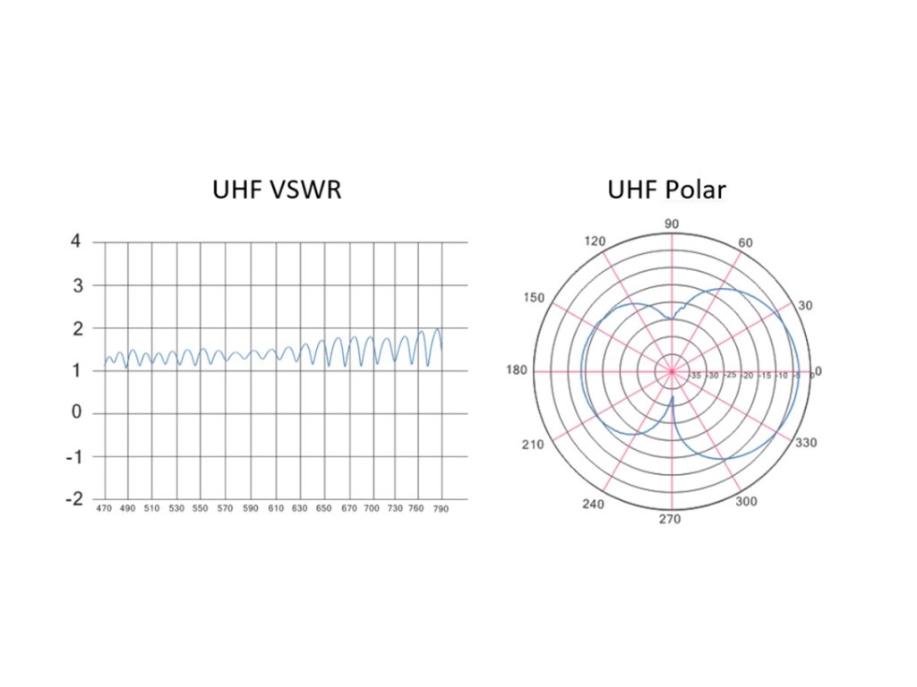 UHF VSWR graf zobrazuje účinnost antény v pásmu UHF. Koeficient rovný 1 znamená přeměnu všech elektromagnetických vln na elektrický signál. S grafem UHF Polar je možné pozorovat oblasti prostoru antény s nejlepším ziskem. Anténa Xany 2in1 je směrová, to znamená nejlepší příjem signálu v případě natočení antény k vysílači.