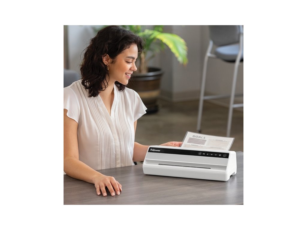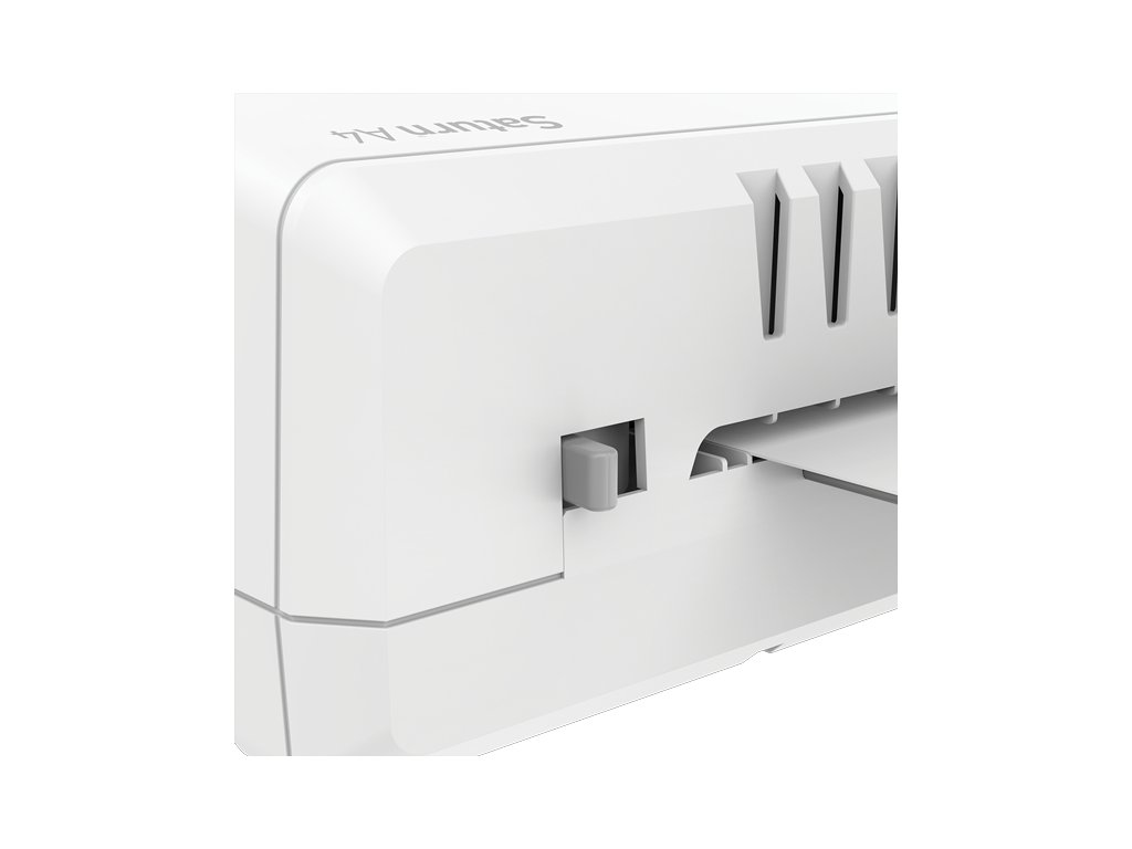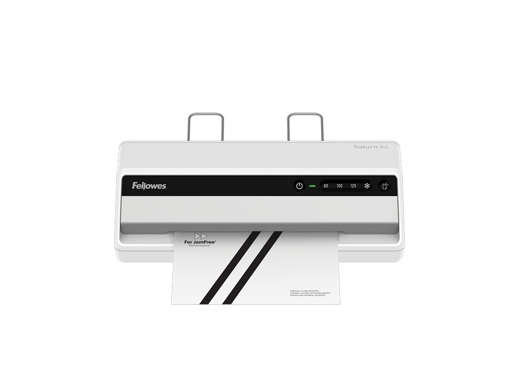 Fellowes laminátor Saturn3i A4 s novým atraktivním designem a inovovaným systémem zrychleného výhřevu. Laminování za cca 1 min od zapnutí. Umožňuje kvalitní laminaci až do formátu A4 v rozsahu 80–125 mic tloušťky laminovacího filmu, včetně laminace fotografií. Max. tloušťka dokumentu 0,6 mm.Je vhodný pro laminaci v kanceláři. Technologie InstaHeat – zrychlený výhřev stroje na pracovní teplotu. Stroj je vybaven systémem HeatGuard Technology™ – zdvojenou tepelnou ochranou laminovacího prostoru, která zajišťuje rychlé vyhřátí stroje do pracovního stavu a zamezuje zbytečnému ohřívání těla krytu laminátoru. Stroj je vybaven unikátním systémem Jam Free, který významně snižuje riziko uvíznutí laminovaného dokumentu uvnitř stroje. Laminátor disponuje systémem pro uvolnění válců a případné zpětné vysunutí laminovaného dokumentu – uvolňovací páčka na zadní části stroje. Prosvětlený LED diodový displej usnadňuje výběr pracovního stavu.