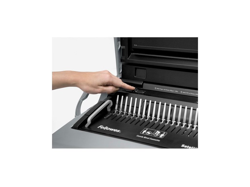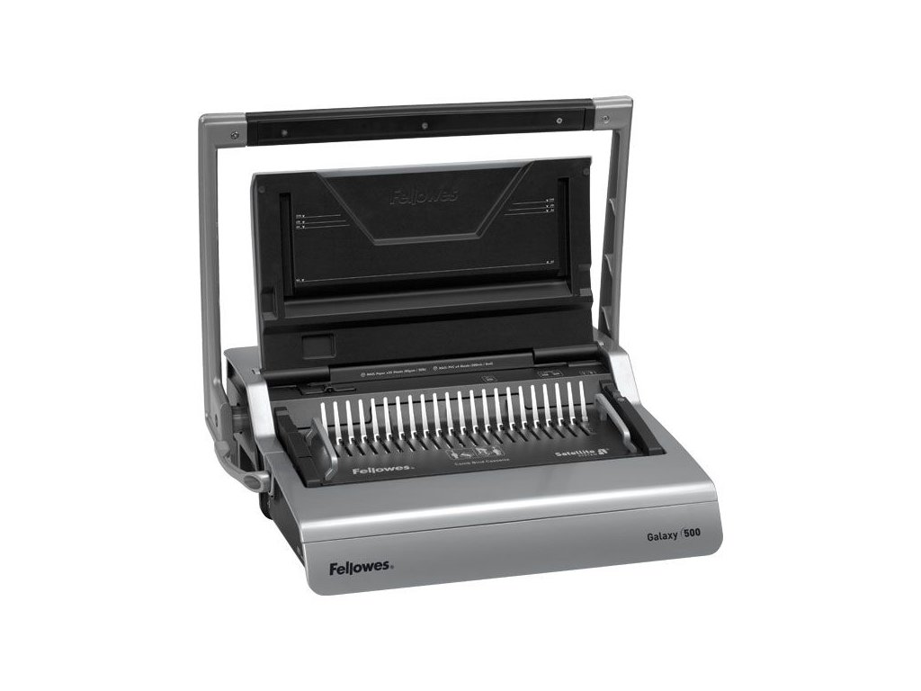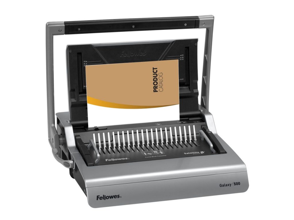 Jedinečné provedení robustního vázacího stroje s uživatelsky samostatně provozovatelnou vázací jednotkou nabízí model Fellowes Galaxy. Děrovací kapacita až 28 listů 80 g papíru. Kapacita vazby až 500 listů (do průměru hřbetu 50 mm). Možnost nastavení vzdálenosti děr od okraje svazku. Vyřaditelné perforační nože (pro formát A5).Velký odpadní šuplík s možností uložení plastový hřbetů. Integrovaná měrka pro správnou volbu průměru hřbetu. Na čelní straně stroje je průzor pro snadnou kontrolu zaplnění odpadního prostoru.