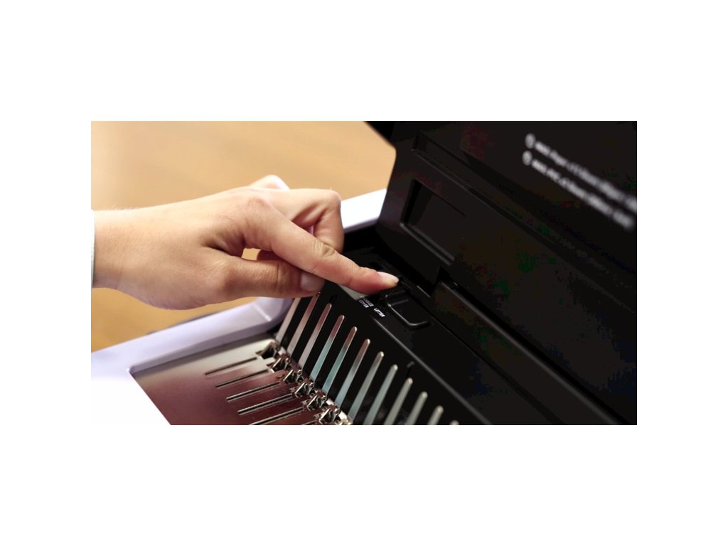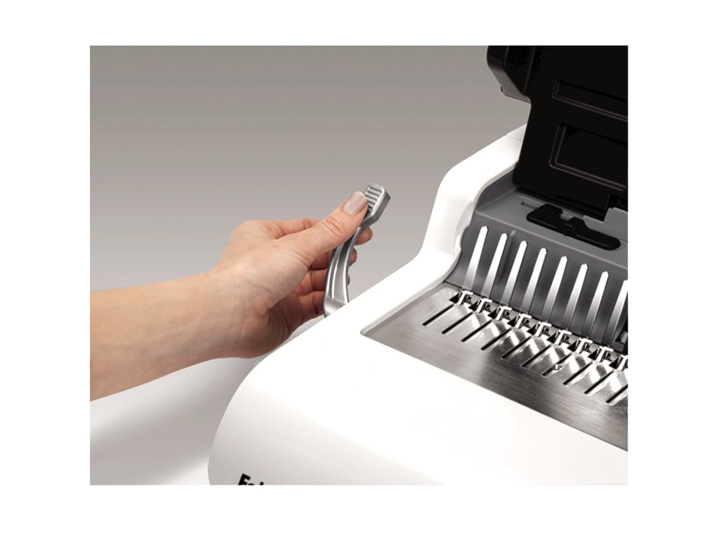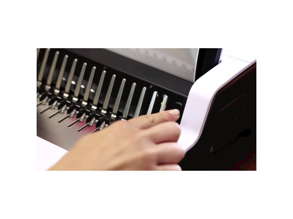 Stroj je vybaven větším zásobníkem na uložení několika plastových hřbetů a integrovanou měrkou pro správnou volbu průměru hřbetu. Průzor na čelní straně stroje slouží pro snadnou kontrolu zaplnění odpadního prostoru.