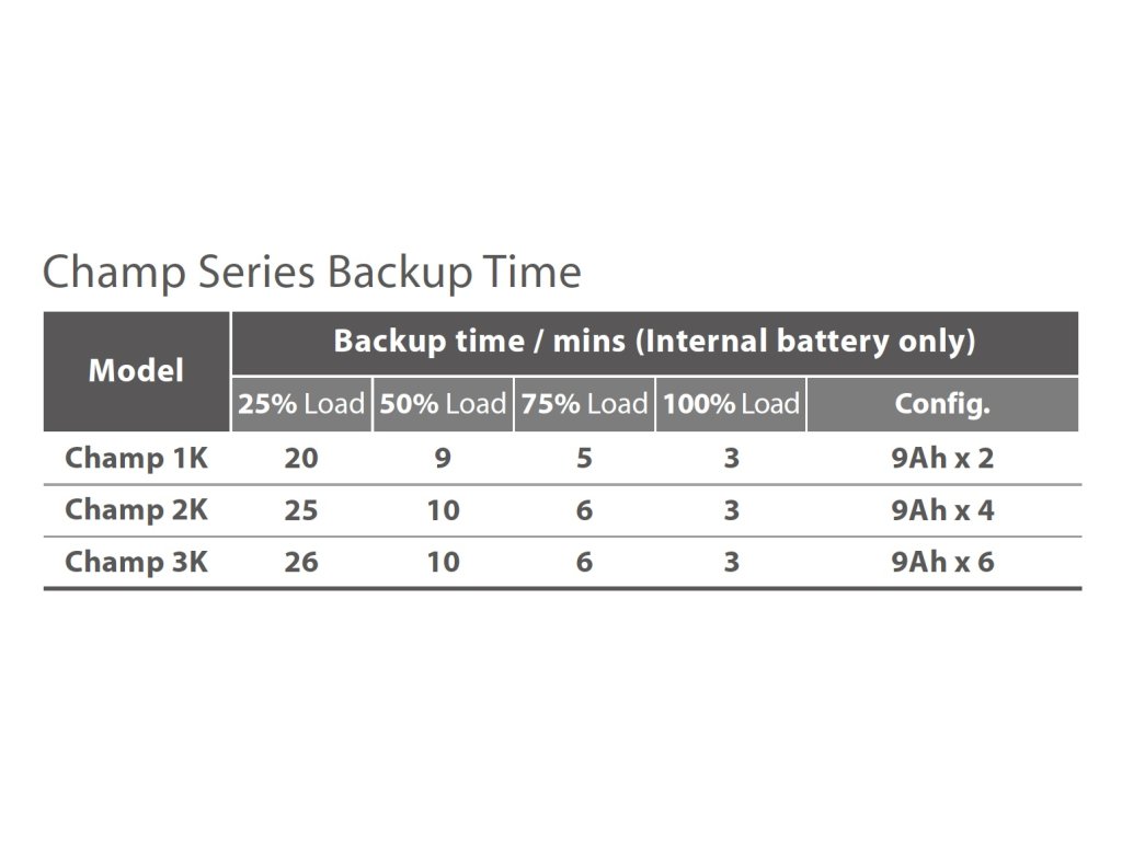 Řada Champ Tower Schuko je verze záložních zdrojů s vysokou hustotou dvoukonverzních online UPS s výkonovým faktorem 0.9. Je navržen v malém rozměru s mikroprocesorovým řadičem. Vhodné použití jako záložní zdroj ve firmách pro napájení serverů, s maximální hlučností 50dB na 1 metr. Má také standardní porty USB a RS-232 s vestavěným inteligentním slotem pro další adaptéry, převodníky protokolů a kartičky kontaktů.