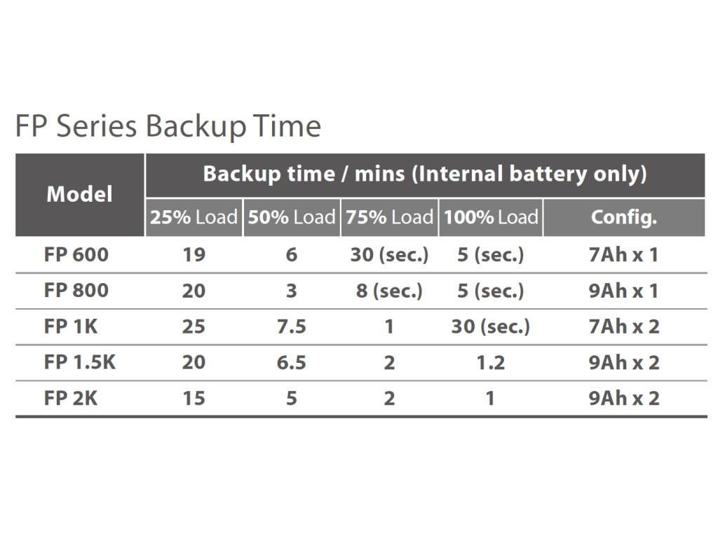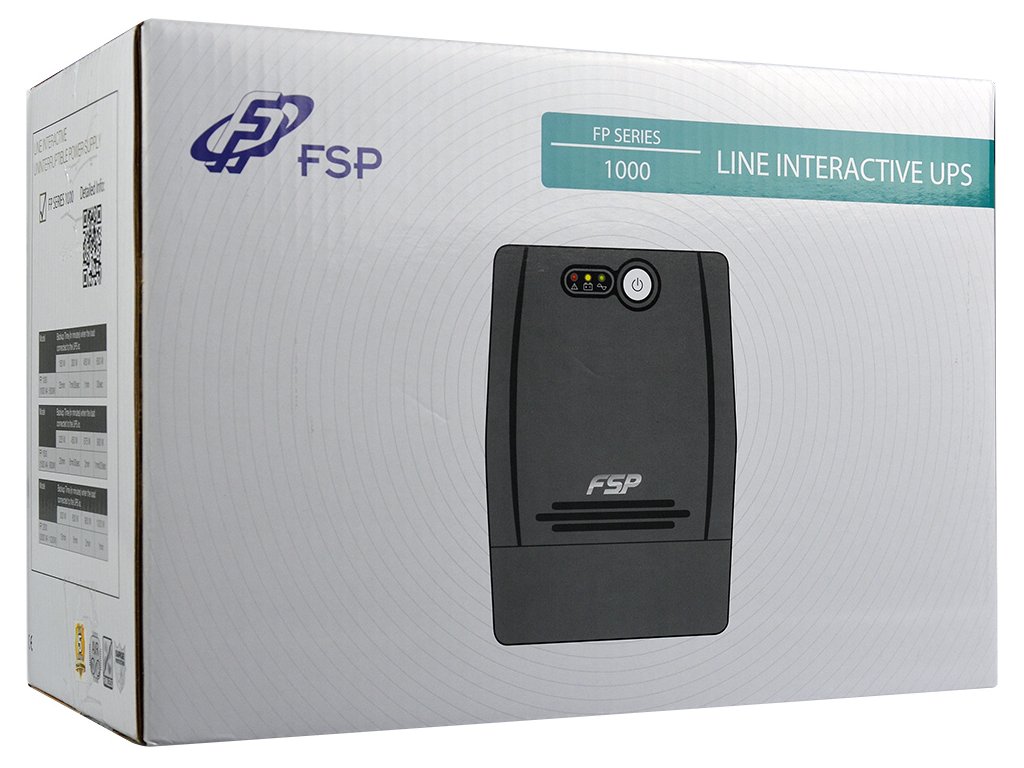 UPS zdroj slouží jako záložní baterie, která udrží počítače, servery a jinou IT techniku v chodu při výpadku elektrického proudu. Přednosti tohoto modelu jsou především jeho kompaktní rozměry, vysoká spolehlivost zaručená kvalitním mikroprocesorem, odolnost vůči automatickému vypnutí, nabíjení i v off-režimu a funkce studeného startu.FP série UPS FSP/Fortron nemá možnost komunikace s PC (není obsažen USB ani RS-232 komunikační port). V případě požadavku na komunikační port použijte UPS z řady EP série.