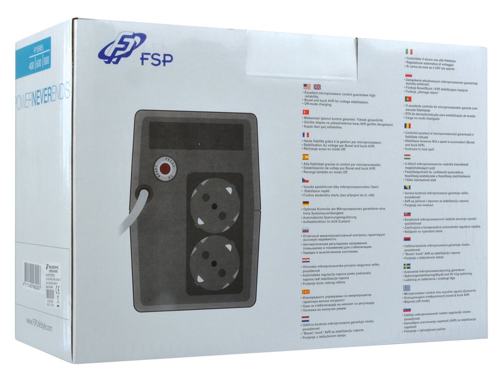 UPS zdroj slouží jako záložní baterie, která udrží počítače, servery a jinou IT techniku v chodu při výpadku elektrického proudu. Přednosti tohoto modelu jsou především jeho kompaktní rozměry, vysoká spolehlivost zaručená kvalitním mikroprocesorem, odolnost vůči automatickému vypnutí, nabíjení i v off-režimu a funkce studeného startu.FP série UPS FSP/Fortron nemá možnost komunikace s PC (není obsažen USB ani RS-232 komunikační port). V případě požadavku na komunikační port použijte UPS z řady EP série.