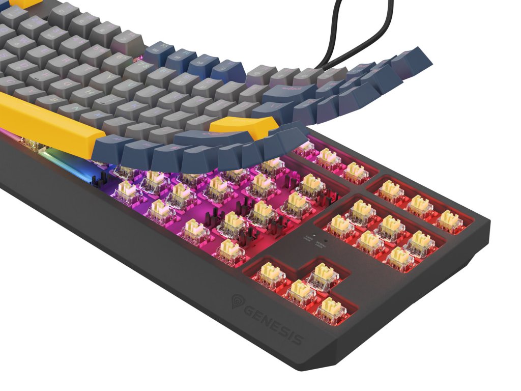Klávesnici Genesis Thor 230 TKL jsme vybavili lineárními spínači Outemu Red, které vynikají vysokou přesností, aktivací bez ohledu na místo stisknutí klávesy a vysokou dynamikou. Víme však, že jako hráč můžete mít své vlastní preference. Proto jsme do Genesis Thor 230 TKL implementovali Hot Swap - techniku, která vám umožní nahradit jakýkoli třípinový mechanismus mikrospínačem od společností jako Outemu, Akko, KTT. Jednoduše vytáhněte nainstalovaný mechanismus a zapojte nový. Díky systému Hot Swap také nemusíte kupovat novou klávesnici, když jeden spínač selže. Vyměníte jej během několika sekund. Je to tak jednoduché.