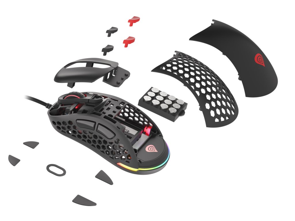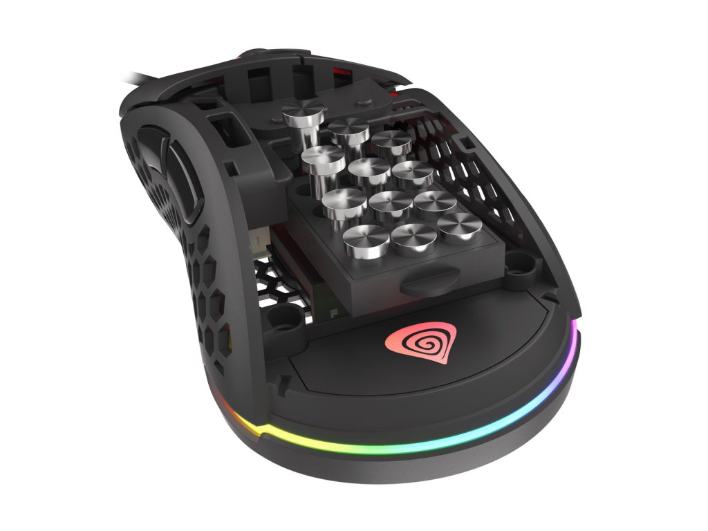 Myš Xenon 800 má pod odnímatelným panelem skrytý prostor až pro 12 závaží, můžete tak podle vašich individuálních požadavků upravit váhu v rozsahu 58 - 78 g.