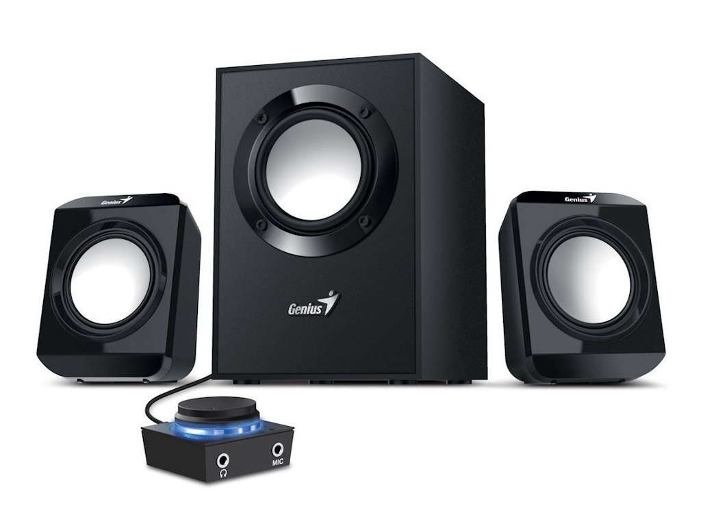 Genius SW-2.1 300 Ver. IIMultimediální reproduktorový systém v konfiguraci 2.1 s celkovým výkonem 10 W. 3" subwoofer nabízí dokonale hluboké basy a dva 2,5" satelity zajistí vysoké vokály. Potěší také ovládání hlasitosti, výstup pro sluchátka a vstup pro mikrofon na podsvíceném ovládacím modulu.