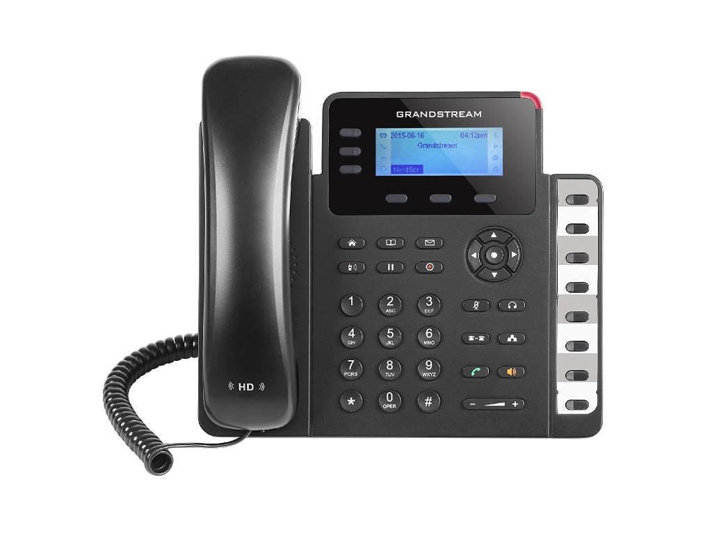 GXP160 disponuje 3 SIP účty, 3 programovatelnými tlačítky, 8 BLF tlačítky s dvojbarevnou LED indikací stavu klapky a možností až 4 cestné audio konference.