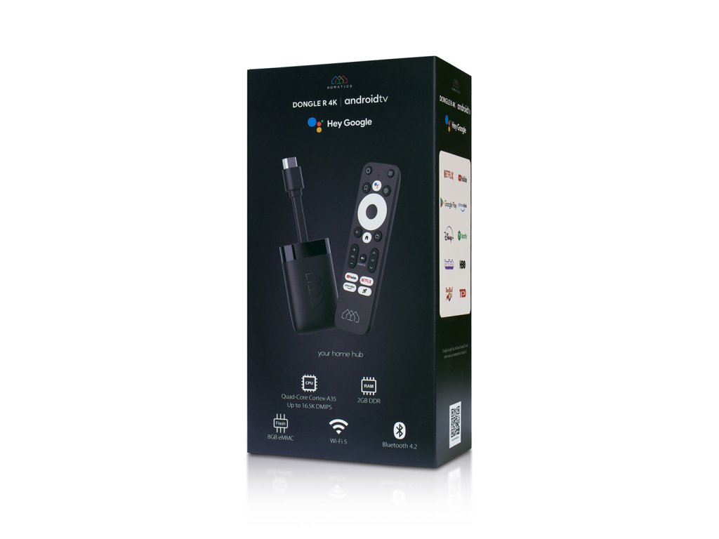Homatics Dongle R 4K je jedno z nejvýkonnějších multimediálních zařízení 4K na trhu v kompaktním provedení, které promění běžný televizor ve výkonný chytrý televizor.Operačním systémem je oficiální Android TV 14 s automatickou aktualizací. V tomto malém zařízení se skrývá výkonný procesor Amlogic S905Y4 (16500 DMIPS), který je podpořen 2GB paměti DDR RAM a 32GB paměti eMMC Flash.