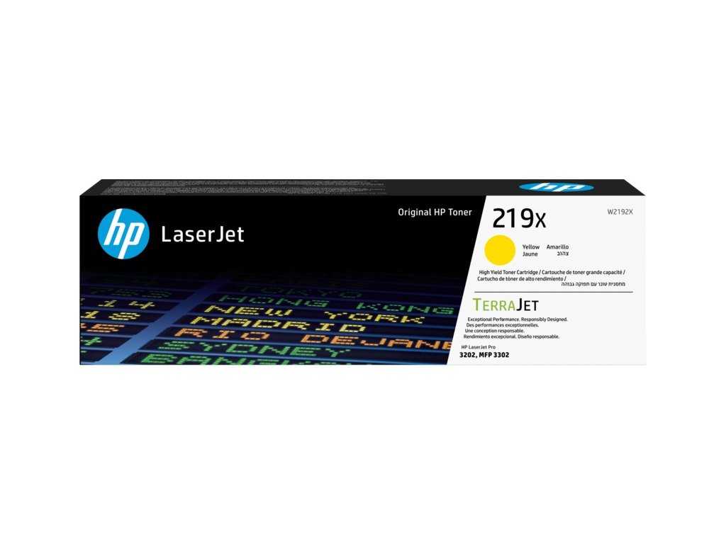 Žlutá originální tonerová kazeta HP 219X LaserJet s vysokou výtěžností (W2192X)Tonerové kazety HP TerraJet jsou navrženy pro efektivní využití toneru pro menší plýtvání a vynikající kvalitu tisku s integrovaným zabezpečením.