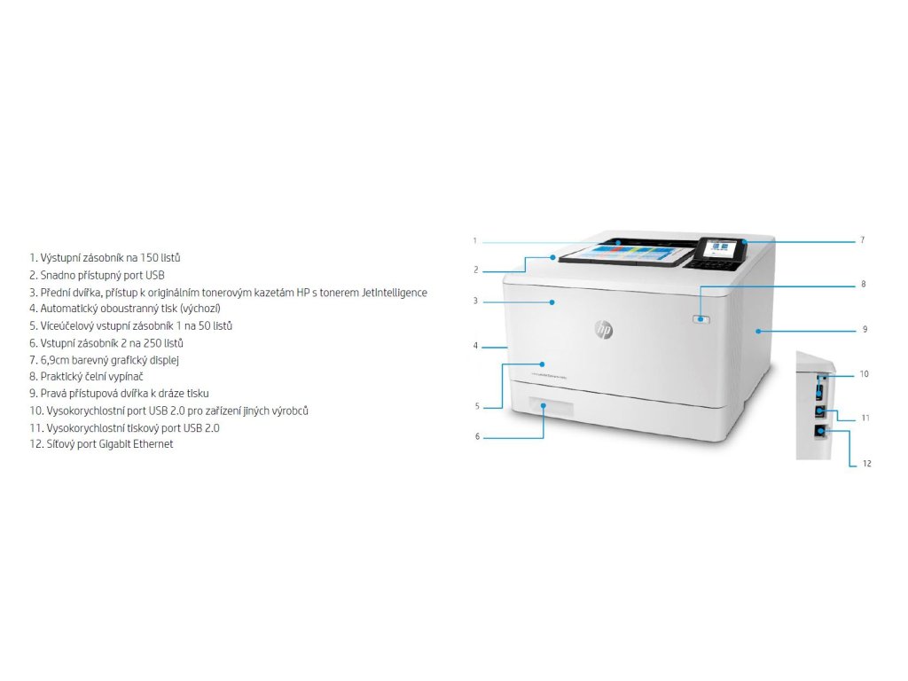 Obsah balení: Tiskárna HP Color LaserJet Enterprise M455dn; Černá originální tonerová kazeta HP LaserJet (cca 2 400 stran); Azurová, purpurová, žlutá originální tonerová kazeta HP LaserJet (každá kazeta cca 2 100 stran); Úvodní příručka; 1x napájecí kabel
