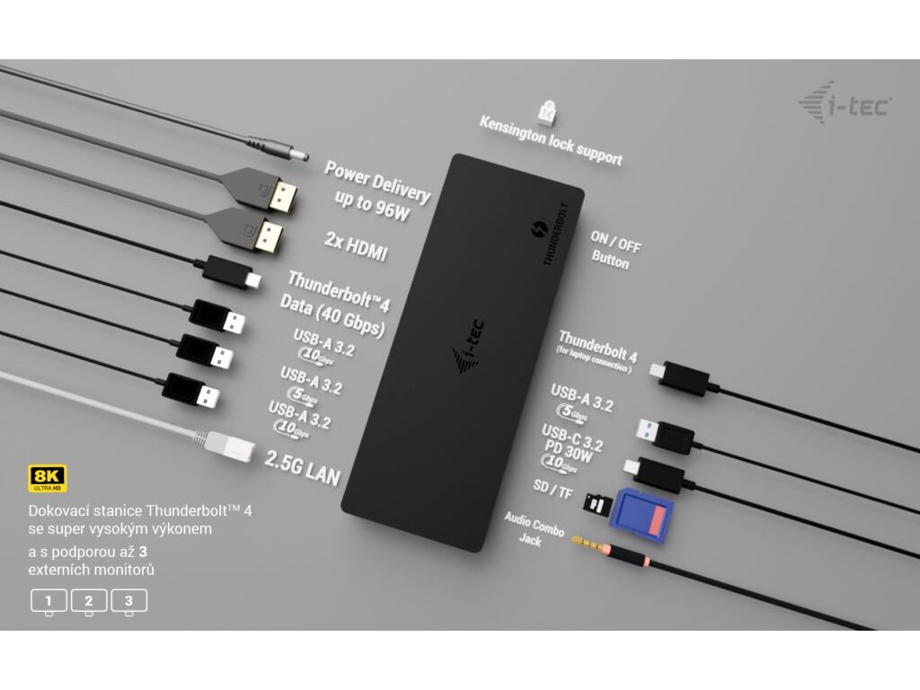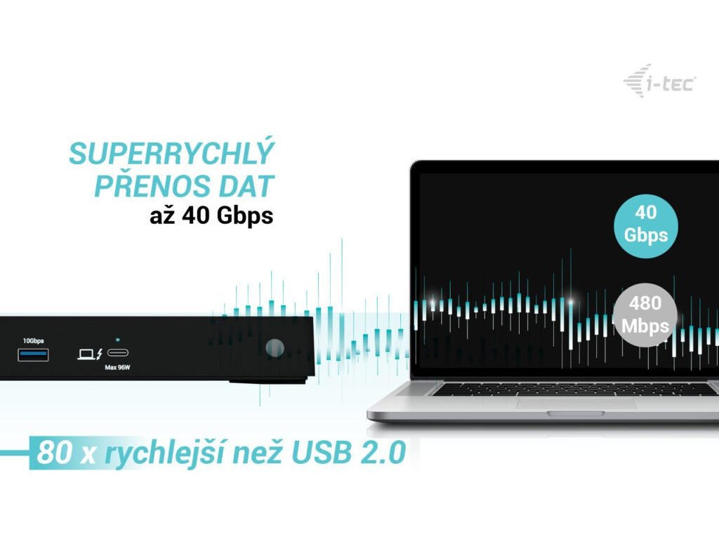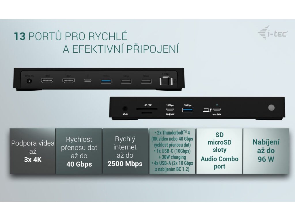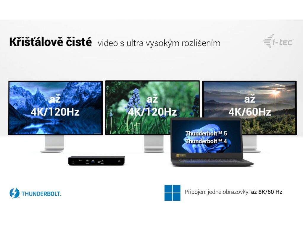 Ultra vysoký výkon, ultrarychlý přenos dat a podpora rozlišení až 8K/60 Hz. Jedna z nejvýkonnějších dokovacích stanic i-tec na trhu!Křišťálově čistý obraz, superrychlý internet a možnost přenášet data rychlostí až 4 GB za sekundu díky integrovanému výstupnímu portu Thunderbolt 4. Můžete také samozřejmě připojit sluchátka nebo audio a nabíjet notebook (96 W), a to vše pomocí jediného kabelu (100 cm certifikovaný Thunderbolt 4 kabel je součástí balení).
