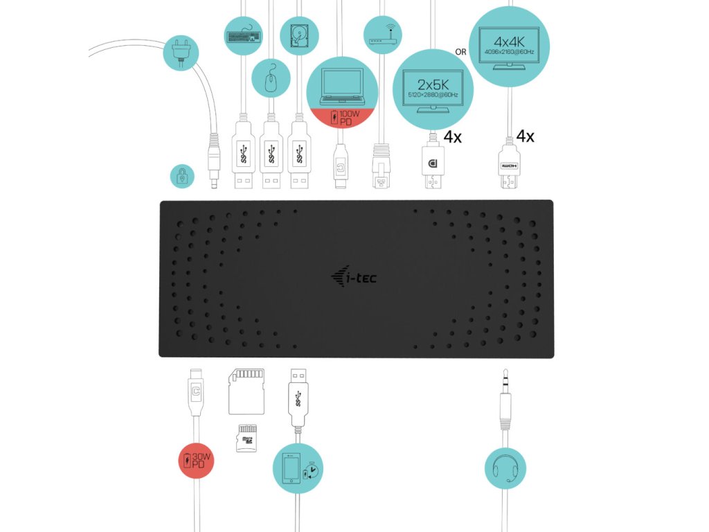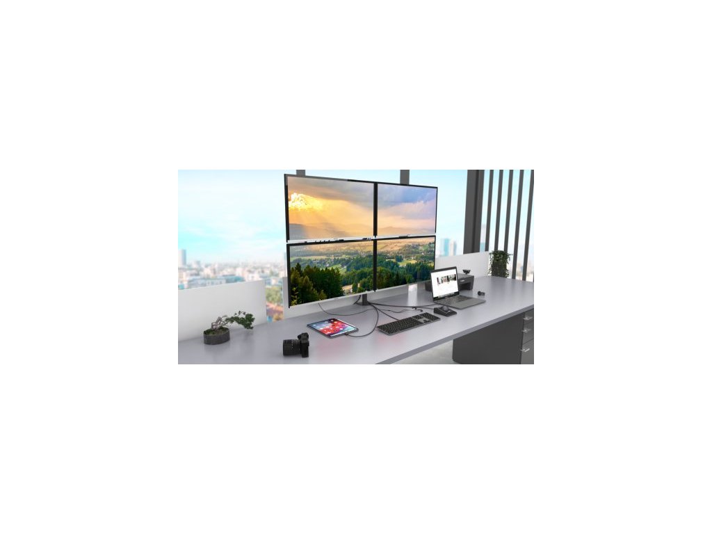 Dokovací stanice s maximálním možným výkonem. Podpora až čtyř externích monitorů v rozlišení 4K / 60 Hz, případně 2x 5K / 60 Hz. Perfektní produkt pro uživatele, kteří vyžadují více monitorů, bez kompromisů v oblasti stability obrazu, rozlišení a obnovovací frekvence. Dokovací stanice je rovněž vybavena rychlonabíjecím portem USB-C (s nabíjecím výkonem až 30W), zejména pro nabíjení chytrých telefonů a tabletů, rychlými USB porty, 2.5 Gbps LAN portem, a rovněž tak i dalšími periferiemi.Dokovací stanici lze připojit prakticky k jakémukoliv notebooku, bez ohledu na značku, model nebo typ operačního systému. Stačí jakýkoliv port USB (3.0, USB-C nebo ThunderboltTM 3 či 4).
