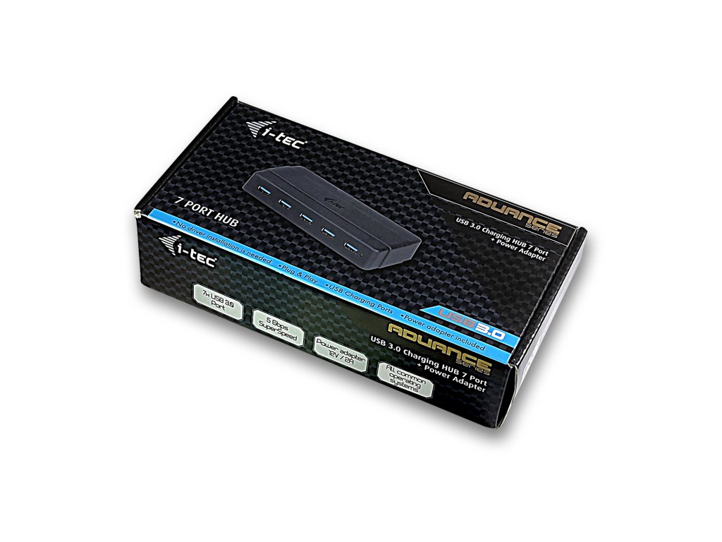 i-tec USB 3.0 Charging HUB 7 Port + Power Adapter je ideálním doplňkem pro každého, kdo má ve svém notebooku, ultrabooku nebo PC nedostatek USB portů a je nucen neustále připojovat a odpojovat svá oblíbená USB zařízení, jako jsou flash disky, mobilní telefony, tablety, digitální fotoaparáty, MP3 přehrávače, tiskárny, apod.Tento Hub nabízí 7 USB 3.0 portů s funkcí Plug & Play a standardním USB nabíjením – HUB automaticky detekuje, jestli je připojeno zařízení pro USB nabíjení. 2 porty umístěné vedle LED podporují také nabíjení dle specifikace BC 1.2, např. pro iPad nebo Samsung tablet.