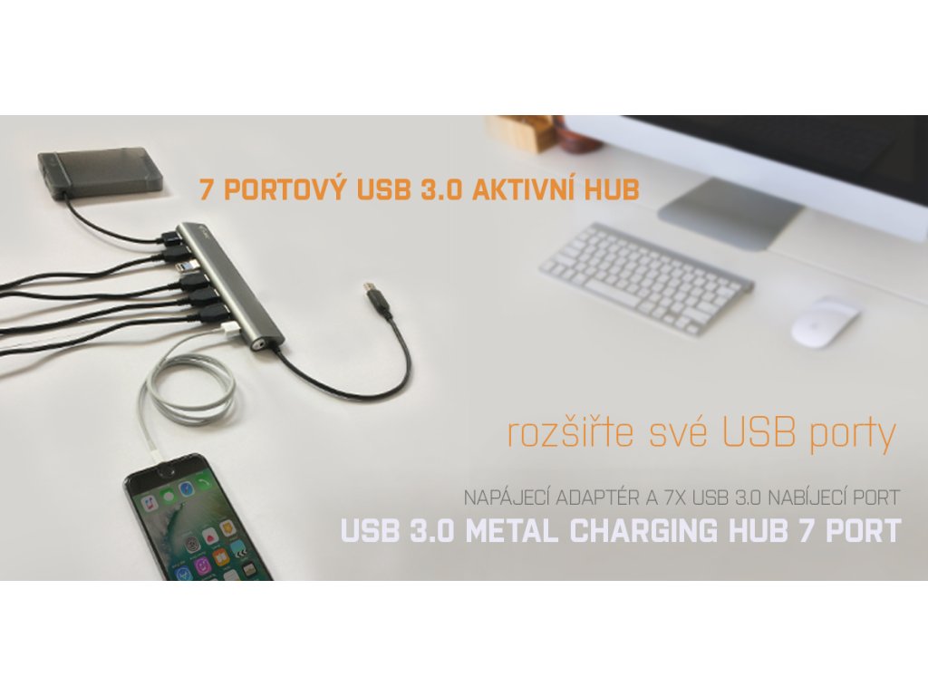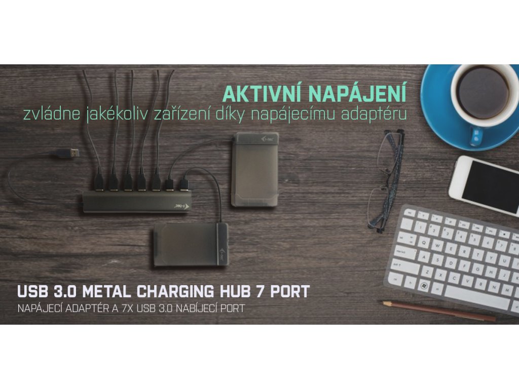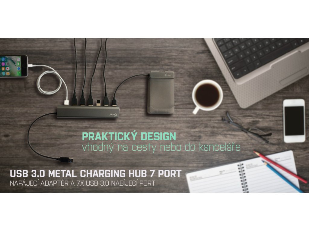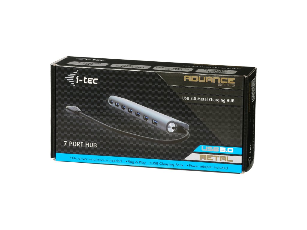i-tec USB 3.0 Metal Charging HUB je ideálním doplňkem pro každého, kdo má ve svém notebooku, ultrabooku nebo PC nedostatek USB portů a je nucen neustále připojovat a odpojovat svá oblíbená USB zařízení, jako jsou flash disky, mobilní telefony, tablety, digitální fotoaparáty, MP3 přehrávače, tiskárny, apod.Tento HUB nabízí 7 USB 3.0 portů s funkcí Plug & Play a standardním USB nabíjením – HUB automaticky detekuje, jestli je připojeno zařízení pro USB nabíjení. Rozhraní USB 3.0 je důležité zejména pro datové přenosy z USB 3.0 paměťových karet a flash disků, kde se nejvíce využije jeho vysoká přenosová rychlost.