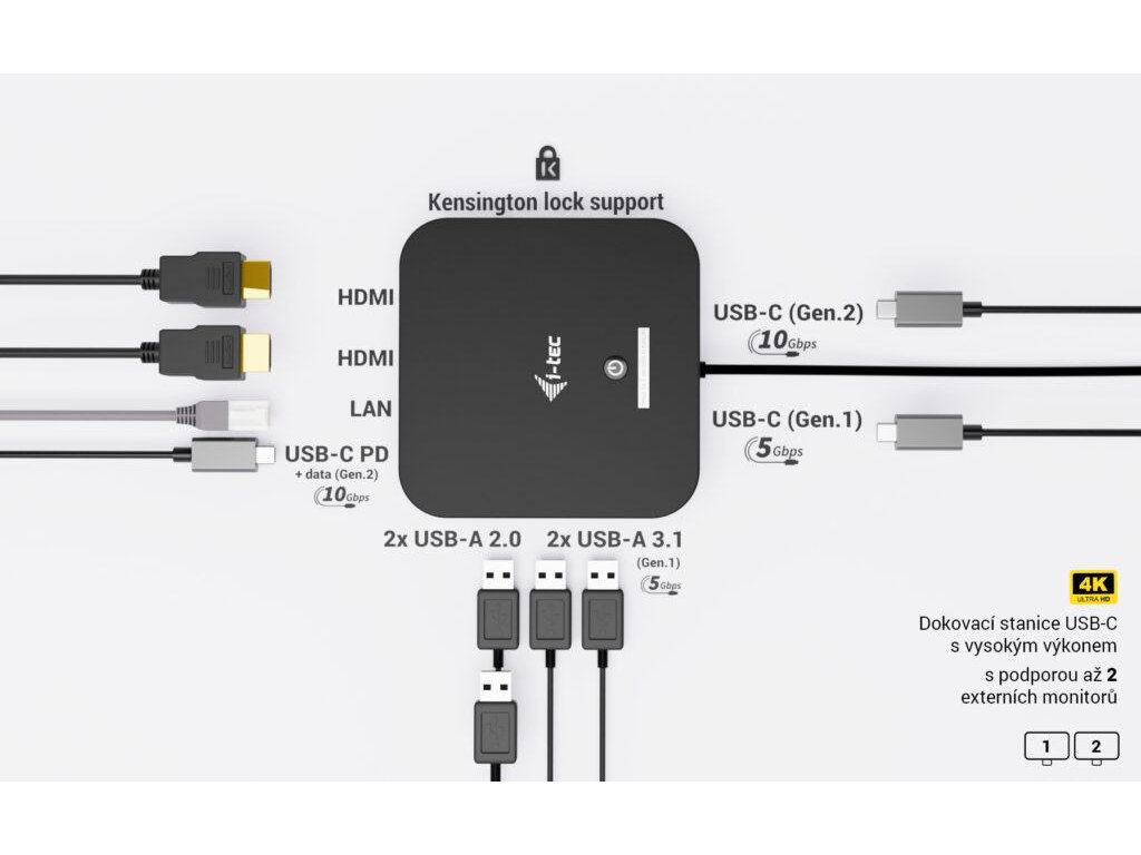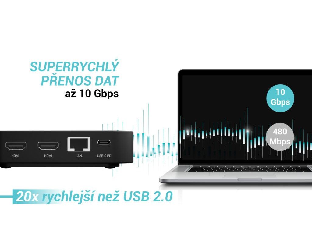Moderní USB-C dokovací stanice pro kancelářské použití s podporou až dvou externích monitorů v rozlišení 4K. Stanice je kompatibilní s jakýmkoli notebookem vybaveným portem USB-C, USB4 nebo Thunderbolt 3/4/5. Nabízí 6 USB portů, spolehlivé a rychlé připojení k firemní síti díky integrovanému LAN portu a možnost instalace za monitor, což z ní dělá ideálního partnera pro profesionální použití. Samozřejmostí je také schopnost nabíjení notebooku nebo tabletu výkonem až 100 W.
