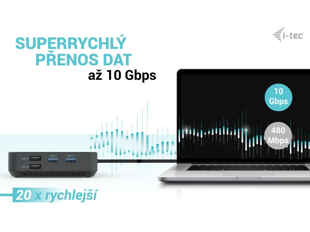 • Dokovací stanici lze používat i bez připojeného napájecího adaptéru. V takovém případě budou vždy funkční video výstupy, síťový port LAN (RJ-45), audio/mic a oba porty USB 2.0. Porty USB 3.0 a datový port USB-C však při zapojení zařízení s vyššími energetickými nároky (například SSD disky, zejména pak jednotky NVMe) nemusí fungovat. V takovém případě může dojít k vypnutí dokovací stanice. Pro využití všech portů a dosažení maximální rychlosti přenosu dat doporučujeme používat dokovací stanici s připojeným napájecím adaptérem.
