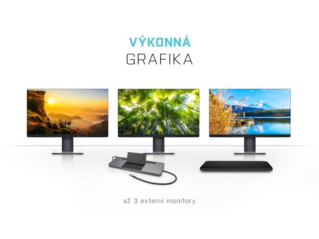 Připojte ke svému notebooku, tabletu, PC nebo smartphonu s novým USB-C nebo Thunderbolt 3 rozhraním své oblíbené příslušenství. Použitím této dokovací stanice získáte přístup k napájení a k výstupu až pro tři externí monitory (platí pro systémy s Windows).