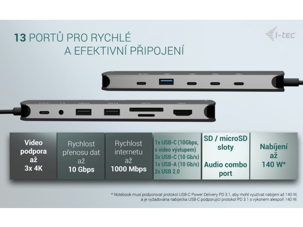 • * Pokud váš notebook nebo tablet podporuje nový a moderní nabíjecí protokol USB-C Power Delivery PD 3.1, dokovací stanice nabídne nabíjecí výkon až 130 W (pokud máte PD 3.0, nabíjecí výkon bude až 100 W).
