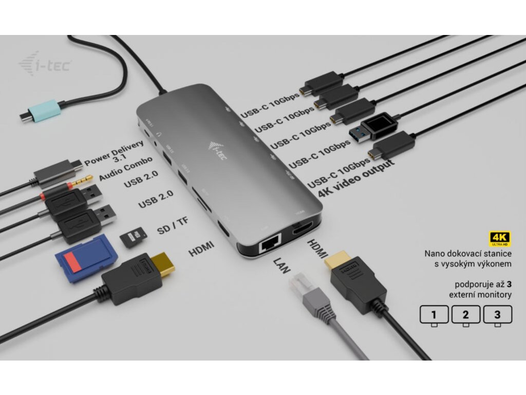 Malá, ale velmi výkonná kovová dokovací stanice USB-C schopná podporovat až tři externí monitory současně*. Stačí připojit notebook nebo tablet (není třeba instalovat ovladače) a můžete využívat výhod rychlého přenosu dat přes USB, připojení k internetu prostřednictvím portu LAN a možnosti připojení náhlavní soupravy. Dokovací stanice samozřejmě dokáže také napájet váš notebook výkonem až 140 W**, což znamená, že budete moci nabíjet všechny notebooky a tablety, které podporují nabíjení přes USB-C (USB-C Power Delivery).Tělo z broušeného hliníku zajišťuje dokovací stanici dostatečnou odolnost a odolnost i při častém cestování. Integrovaný kabel USB-C je dostatečně dlouhý pro pohodlné připojení, i když je port USB-C umístěn v horní části rámu obrazovky (typické pro hybridní notebooky/tablety).