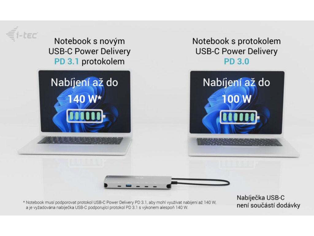 • * Pokud váš notebook nebo tablet podporuje nový a moderní nabíjecí protokol USB-C Power Delivery PD 3.1, dokovací stanice nabídne nabíjecí výkon až 130 W (pokud máte PD 3.0, nabíjecí výkon bude až 100 W).