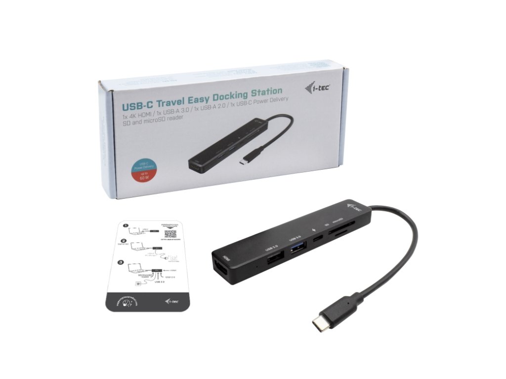 Malá dokovací stanice, která i přes své velmi kompaktní rozměry nabízí vše potřebné pro základní práci. Připojte externí monitor v rozlišení až 4K, dva USB porty poslouží pro připojení vašich periferií a čtečka SD a microSD karet pomůže s přenosem dat. Samozřejmostí je i možnost napájení vašeho notebooku, a to až do 60 W (napájecí adaptér můžete buď použít svůj stávající, případně si nabíječku dokoupit : https://i-tec.pro/produkty/?catg=nabijecky-a-baterie&kon=USB-C).Specifikace