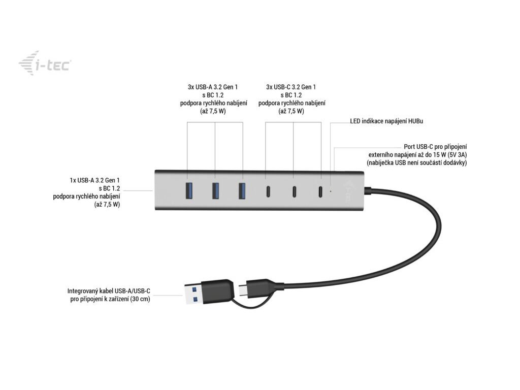 • 1x port USB-C pro připojení přídavného napájení hubu až do 15 W (5 V 3A)
