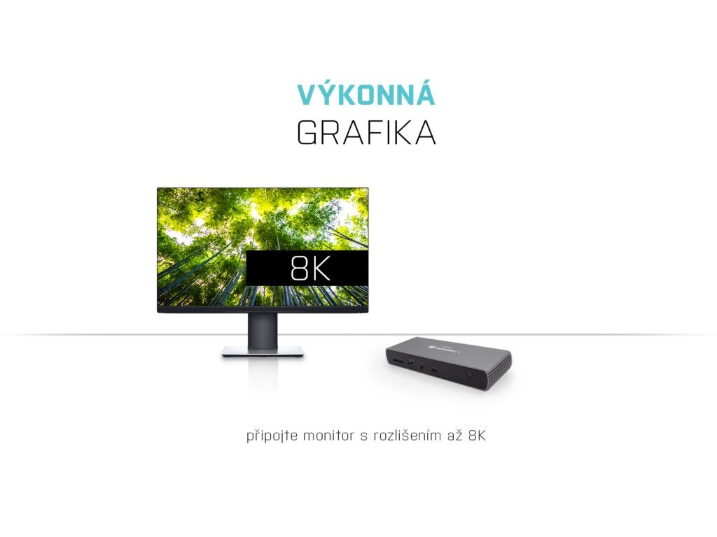 • Díky integrovanému protokolu DP 1.4 můžete tuto dokovací stanici připojit k monitoru s rozlišením až 8K (7680 x 4320)* s obnovovací frekvencí 30 Hz, které se rovná rozlišení čtyřech monitorů, každý v rozlišení 4K. Jedná se tedy o ideální řešení pro grafické designéry, analytiky, vývojáře, filmové editory či nadšence a milovníky videí ve vysokém rozlišení.